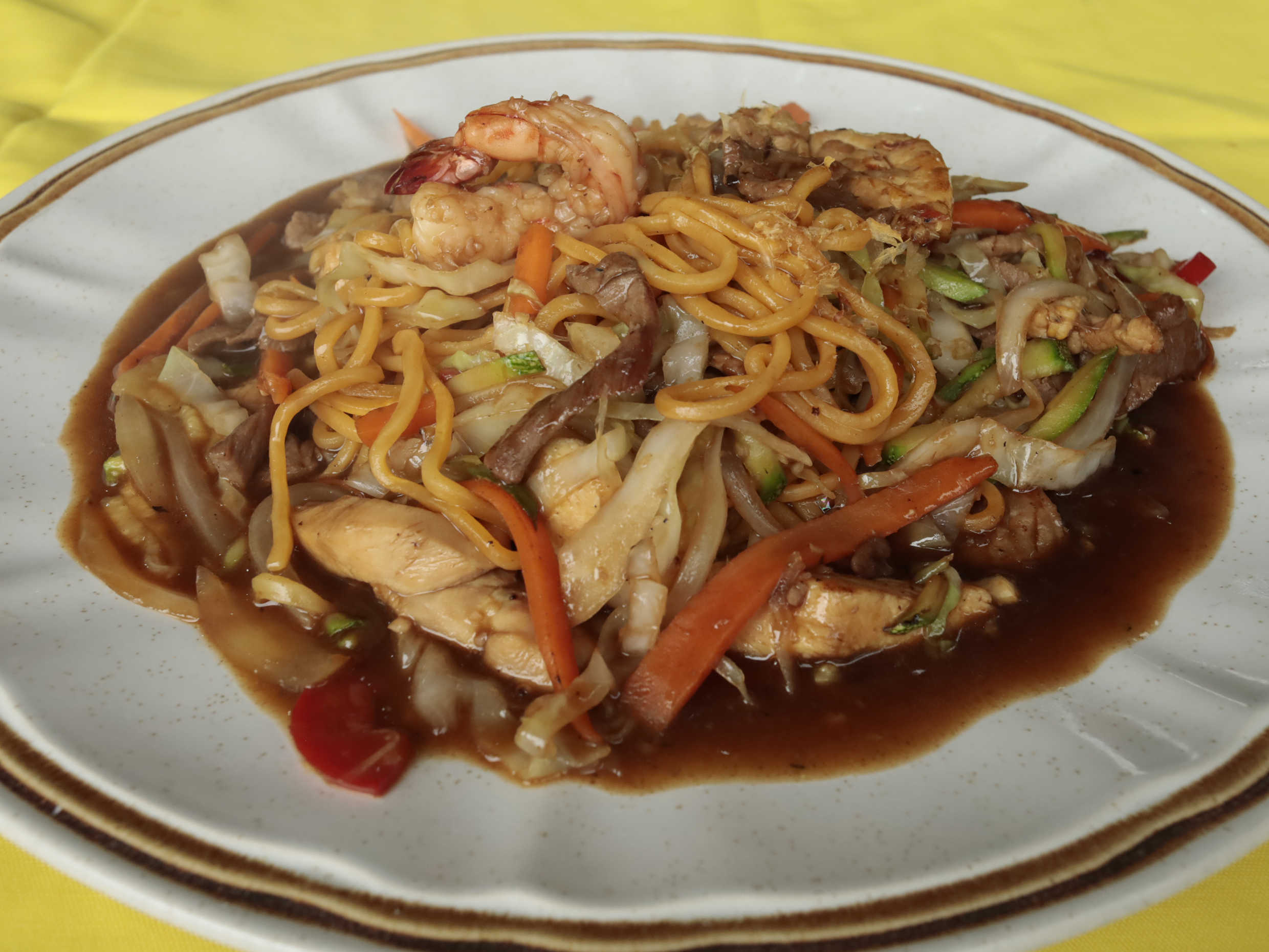 Spaghetti japones salteado con camarón res y pollo.