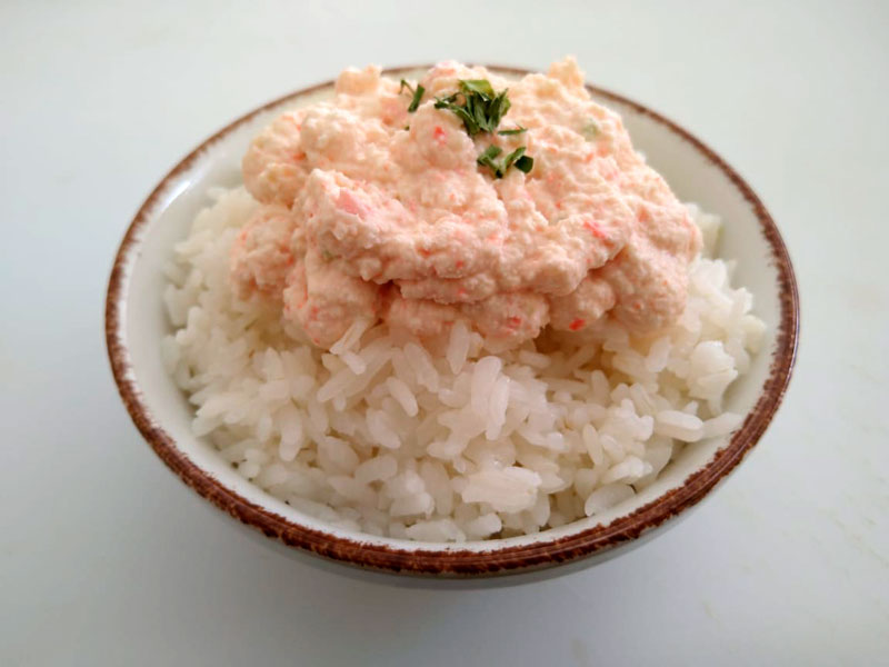 Arroz blanco al vapor con condimento de salmón.