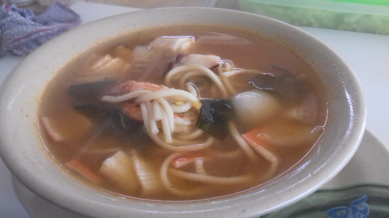 Sopa japonesa picante camarón surimi pulpo pescado y salmón.