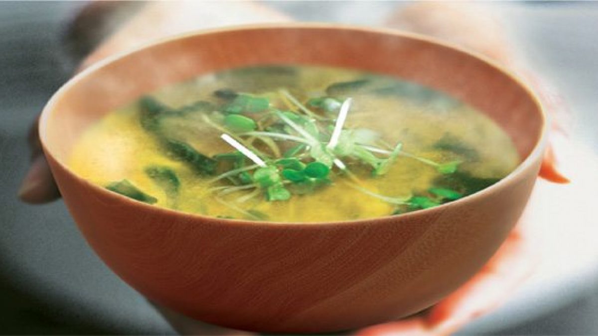 Sopa de miso con tofu cebollin y champiñón.