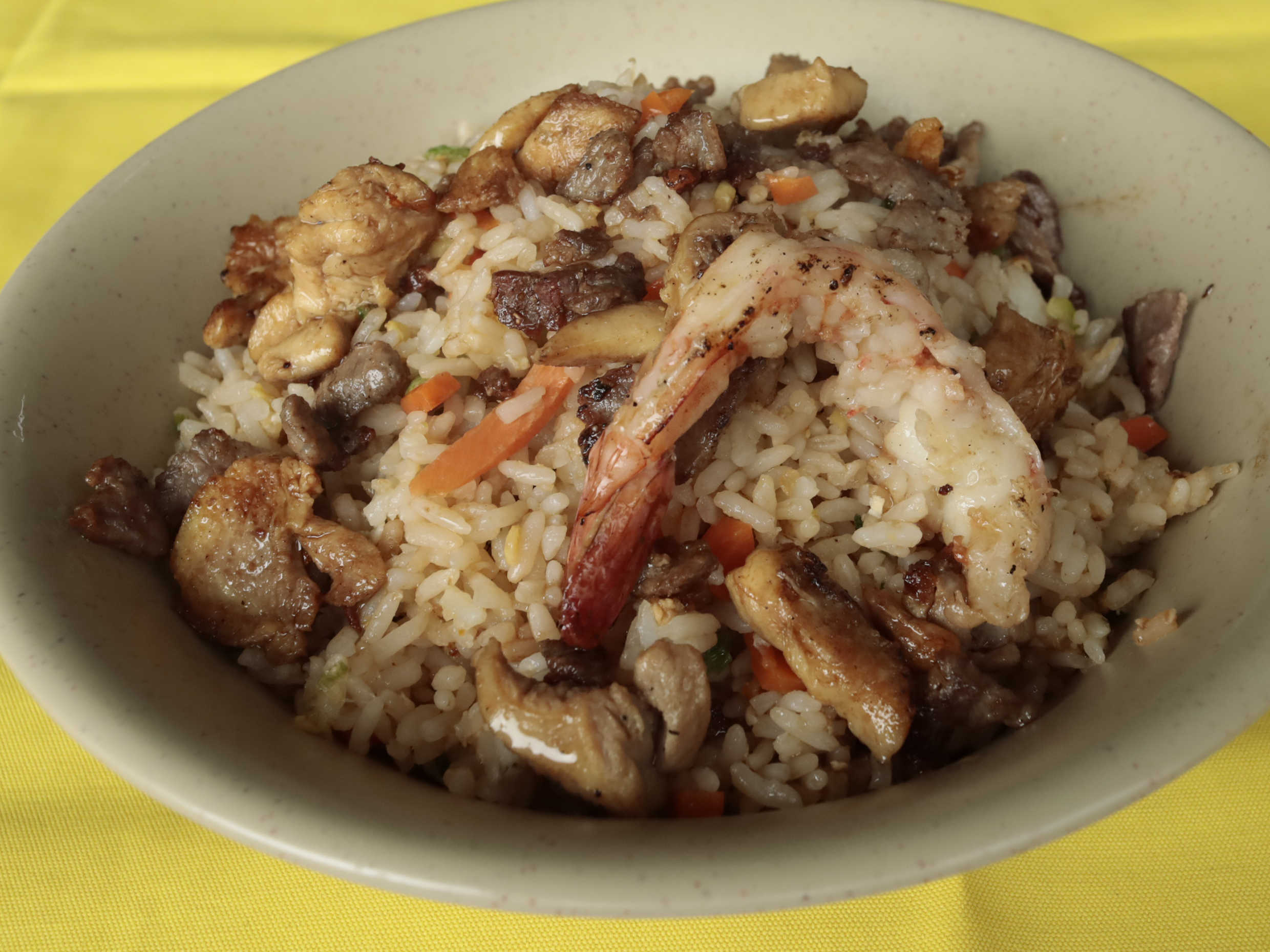 Arroz frito con camarón, pollo y res.