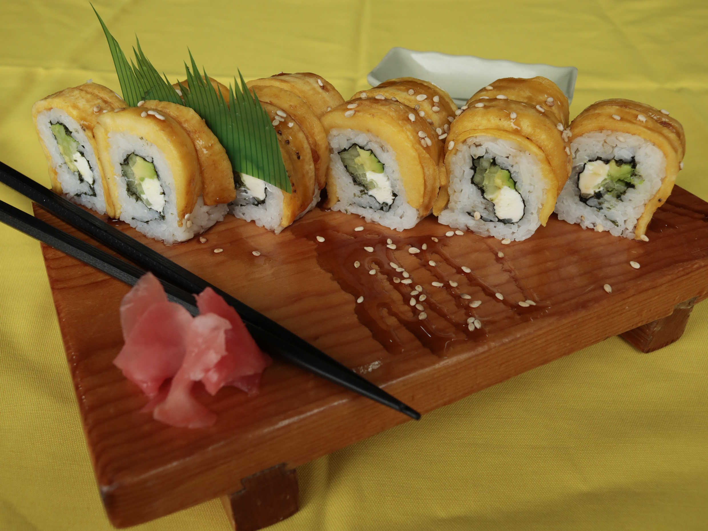 Surimi, queso Philadelphia, pepino, aguacate, cubierto de plátano frito.