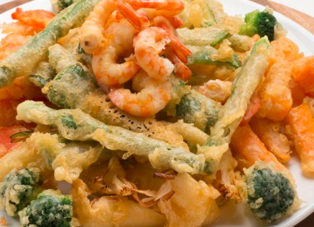 Verduras y camarones capeados.