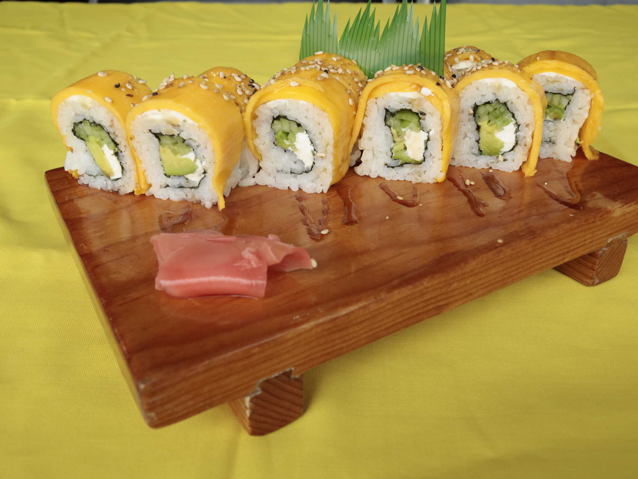 Surimi empanizado, queso Philadelphia, pepino, aguacate, cubierto de mango y salsa de anguila.