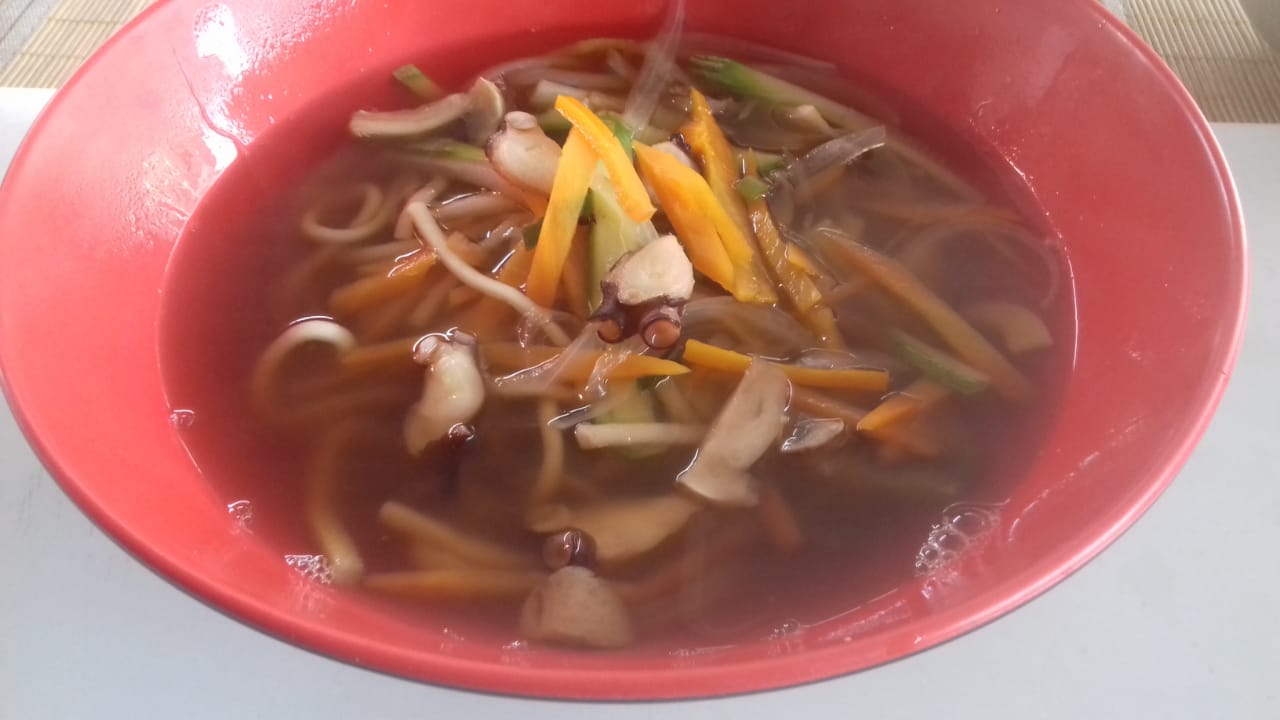 Sopa japonesa fideo grueso verduras y pollo.