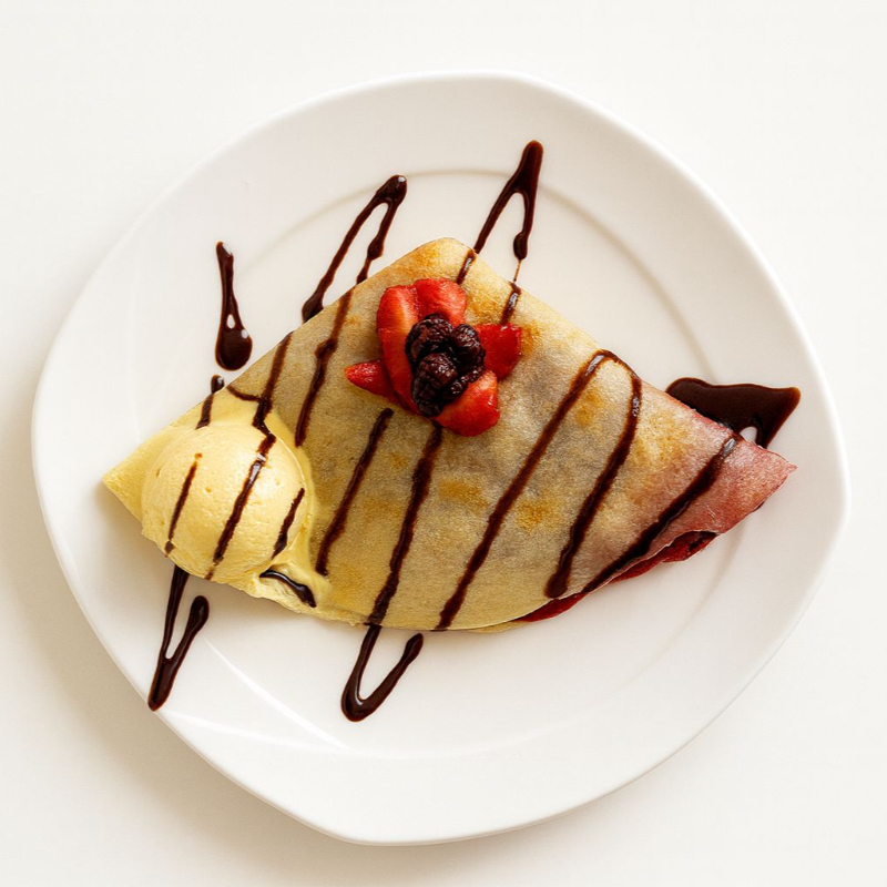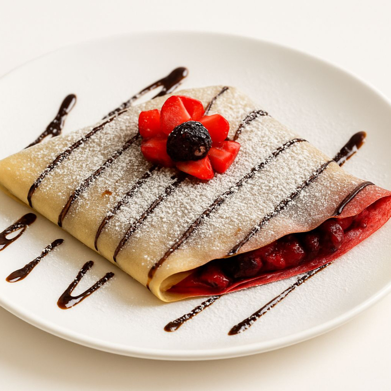 Crepa suave rellena con la fruta de tu elección y decorada con un toque de chocolate. Dulce, fresca y perfecta para consentirte en cualquier momento.
