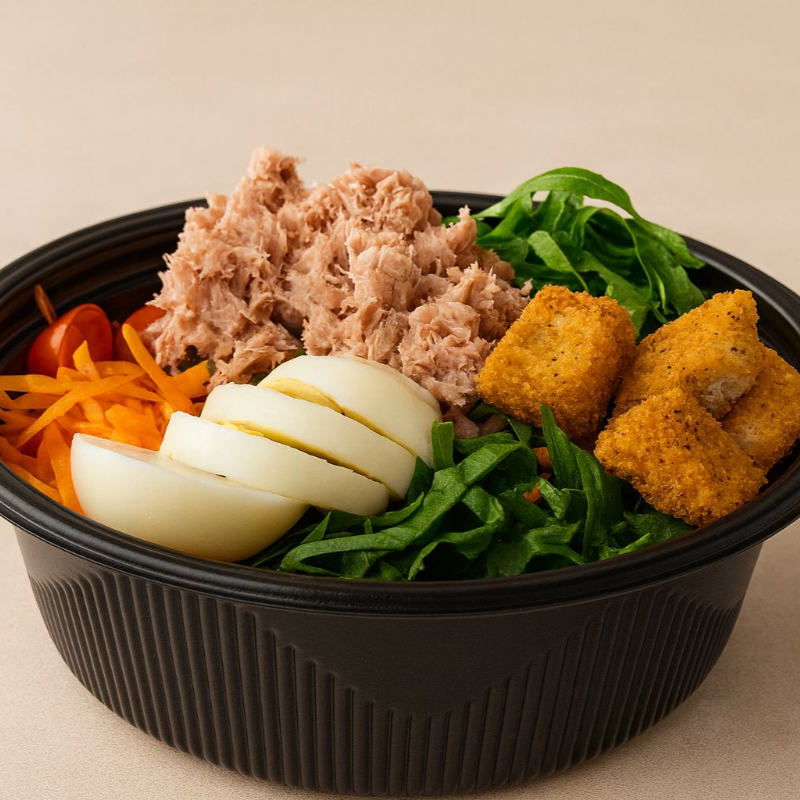 Ensalada fresca con atún y mix de verduras. Ensalada elaborada con lechuga italiana, espinaca, zanahoria, betabel, jitomate cherry, huevo duro y atún. Una opción ligera y nutritiva, acompañada del aderezo de tu elección para complementar su sabor. ¡Perfecta para una comida saludable y deliciosa!