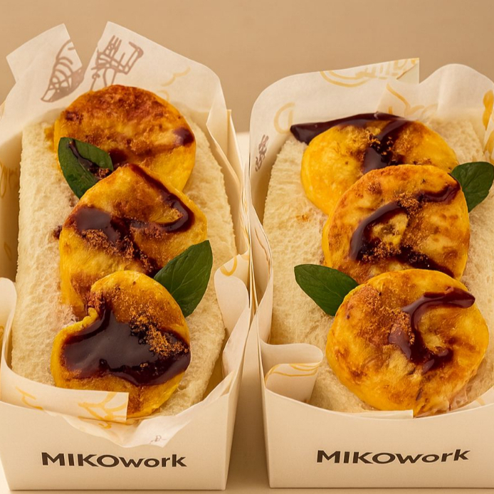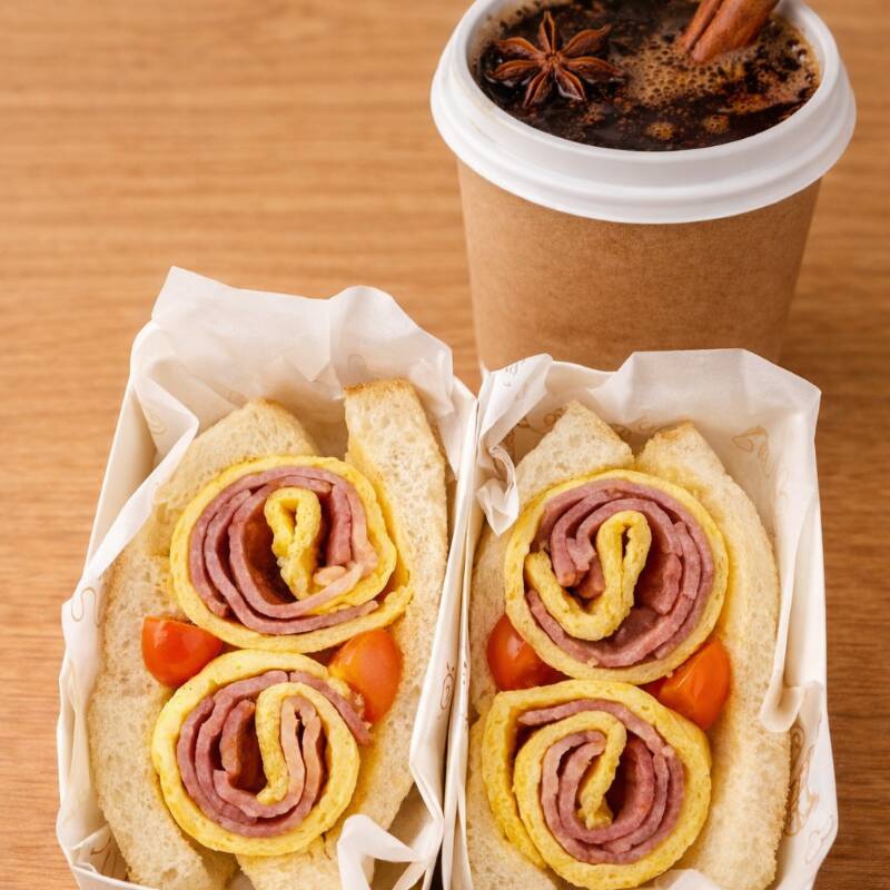 Pan suave tipo milk bread con huevo esponjoso enrollado al estilo japonés, y un toque fresco de jitomate. (tocino, espinacas a elegir) Suave, ligero y delicioso. ¡Perfecto para cualquier momento del día!