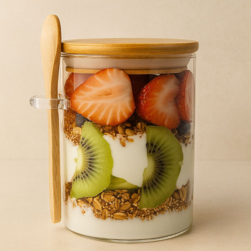 Parfait de yogurt griego con granola crujiente, miel y fruta de temporada. Cremoso, fresco y naturalmente dulce; perfecto para un desayuno ligero o un snack saludable.