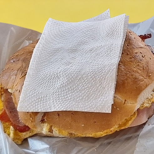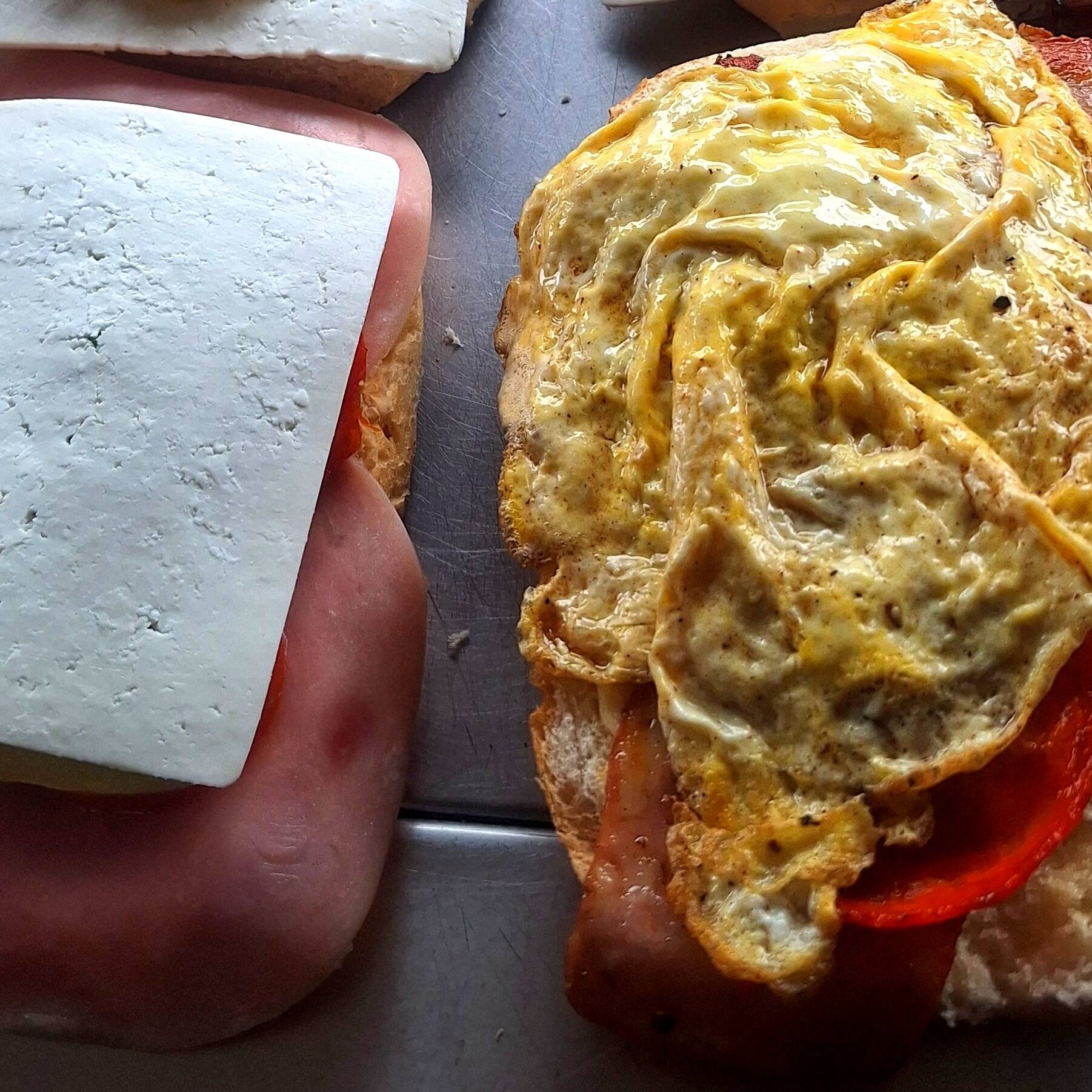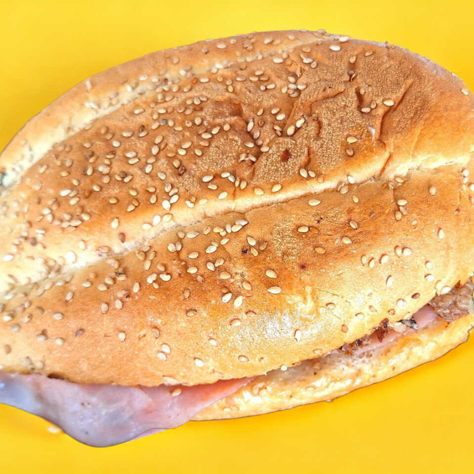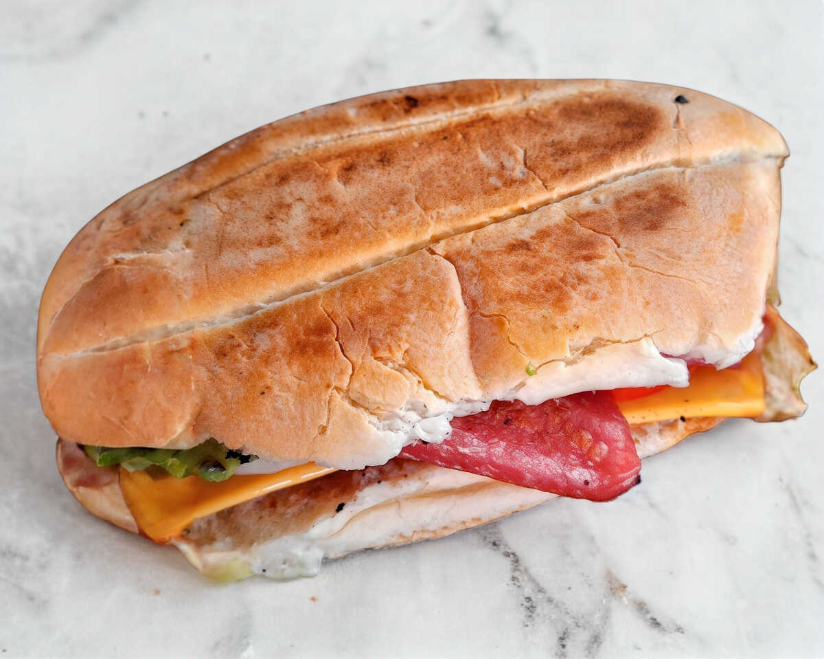 deliciosa torta de pan extra grande con cubierta de ajonjolí tostado, mayonesa, frijoles, jamón, queso blanco, salchicha, pierna, tocineta y huevo acompañado con verduras selectas: jitomate, cebolla, chiles en vinagre y aguacate.