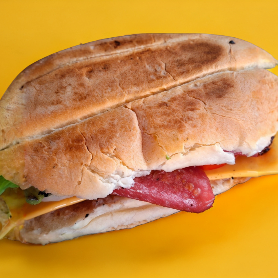 deliciosa torta de pan extra grande con cubierta de ajonjolí tostado, mayonesa, frijoles, jamón y queso blanco, pierna española, salchicha, tocineta, queso manchego y bistec acompañado con verduras selectas: jitomate, cebolla, chiles en vinagre y aguacate.