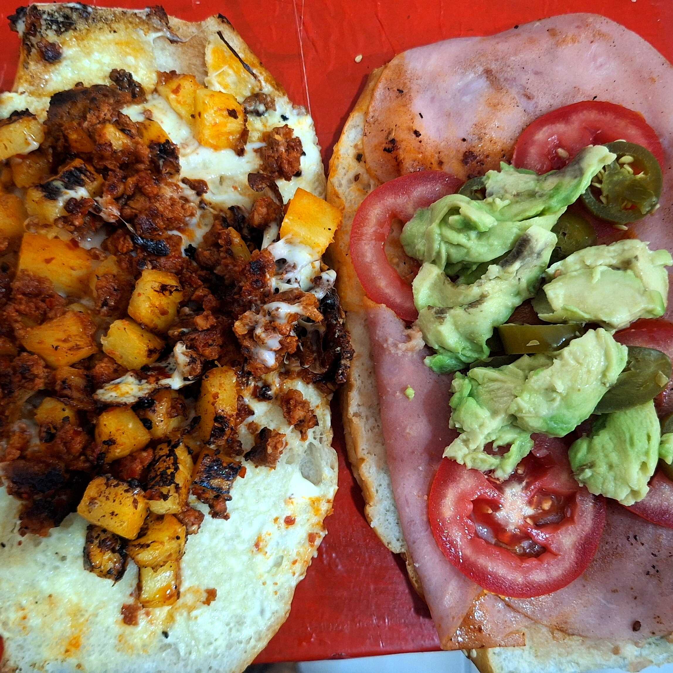 telera chica con mayonesa, frijoles, jamón, longaniza y queso oaxaca acompañada de jitomate, cebolla, chiles en vinagre y aguacate.
