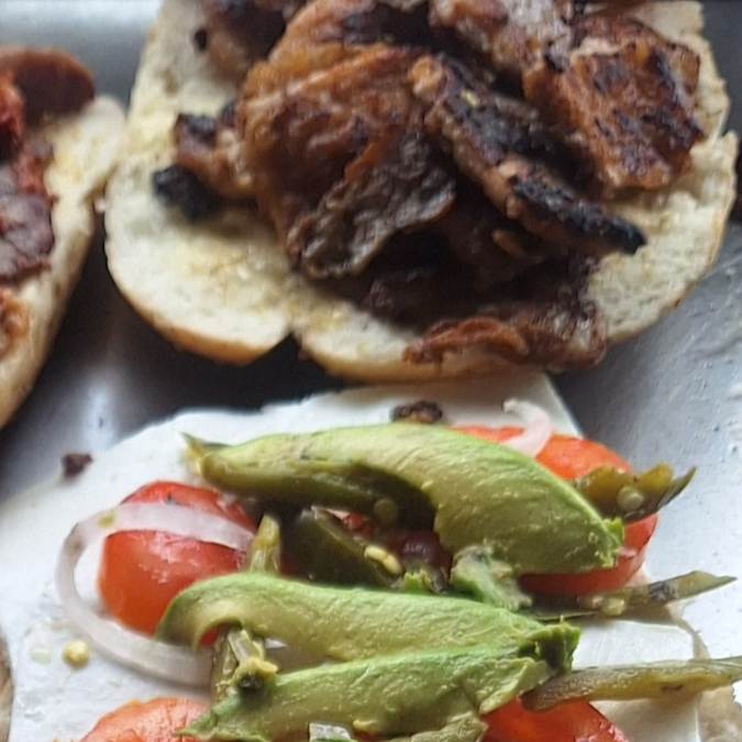 deliciosa torta de pan extra grande con cubierta de ajonjolí tostado, mayonesa, frijoles, queso blanco, bisteck y queso manchego acompañado con verduras selectas: jitomate, cebolla, chiles en vinagre y aguacate.