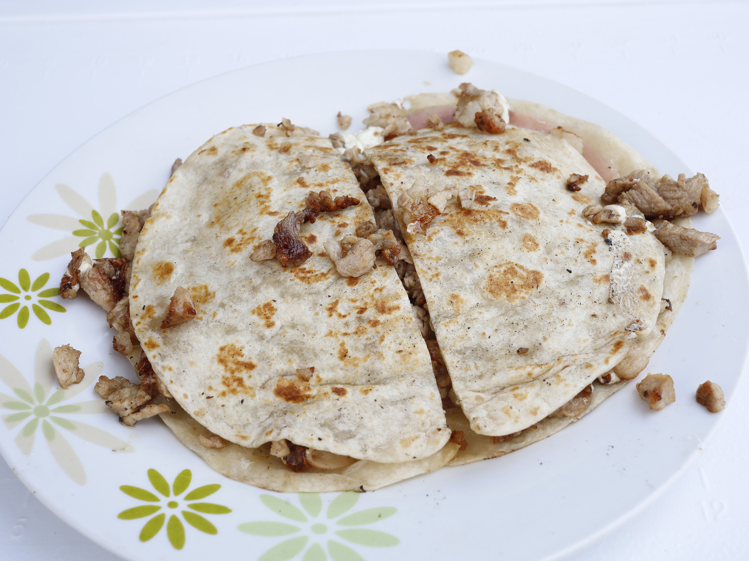 Una quesadilla de tortilla de harina rellena de carne al carbón, cebolla y queso.