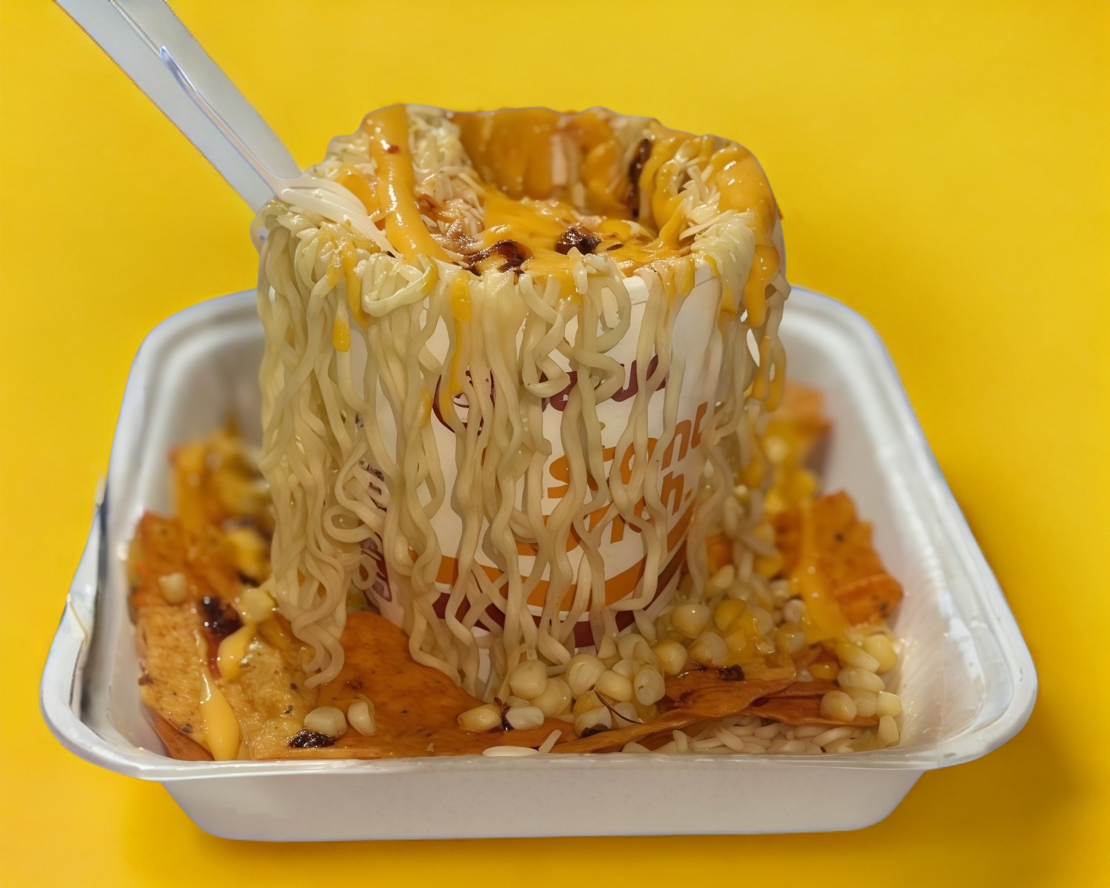 Sopa maruchan servida con esquites, mayonesa, queso amarillo, queso en polvo, acompañado con tu dorito favorito.