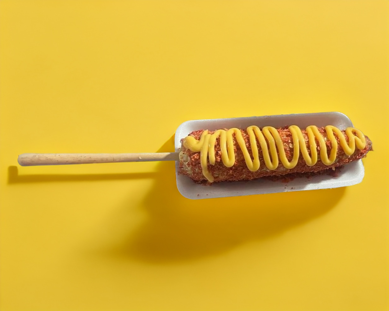 Elote Hervido tradicional con mayonesa, cubierto con tu papita favorita y queso amarillo.