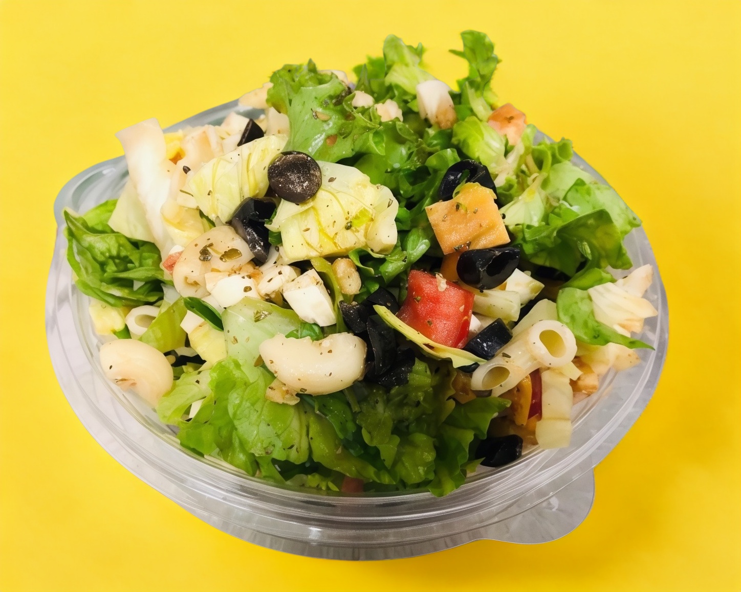 Lechuga, pasta, complementos, semillas (2) y aderezos (1). Se sirve frío