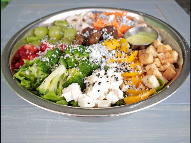 Lechuga, pasta, 4 croquetas de falafel, espinaca, germen de alfalfa, semilla de ajonjolí negro, arándano y aderezo de ajonjolí