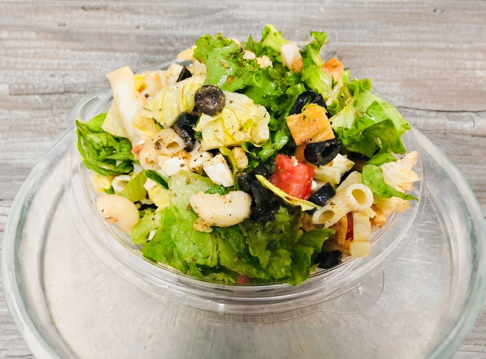Lechuga, pasta, complementos, semillas (1) y aderezos (1). Se sirve frío.