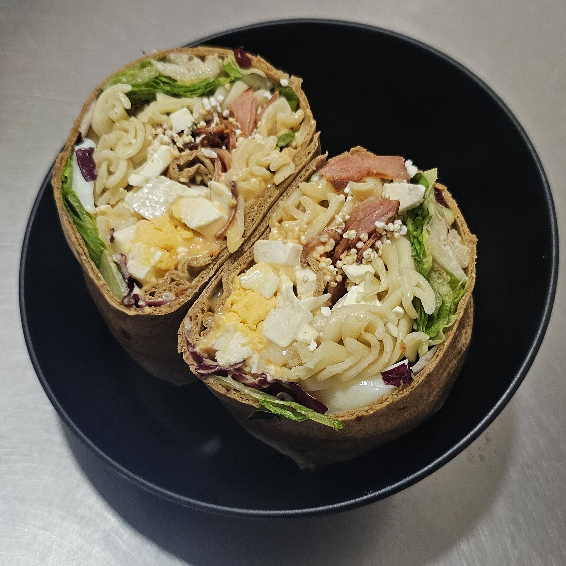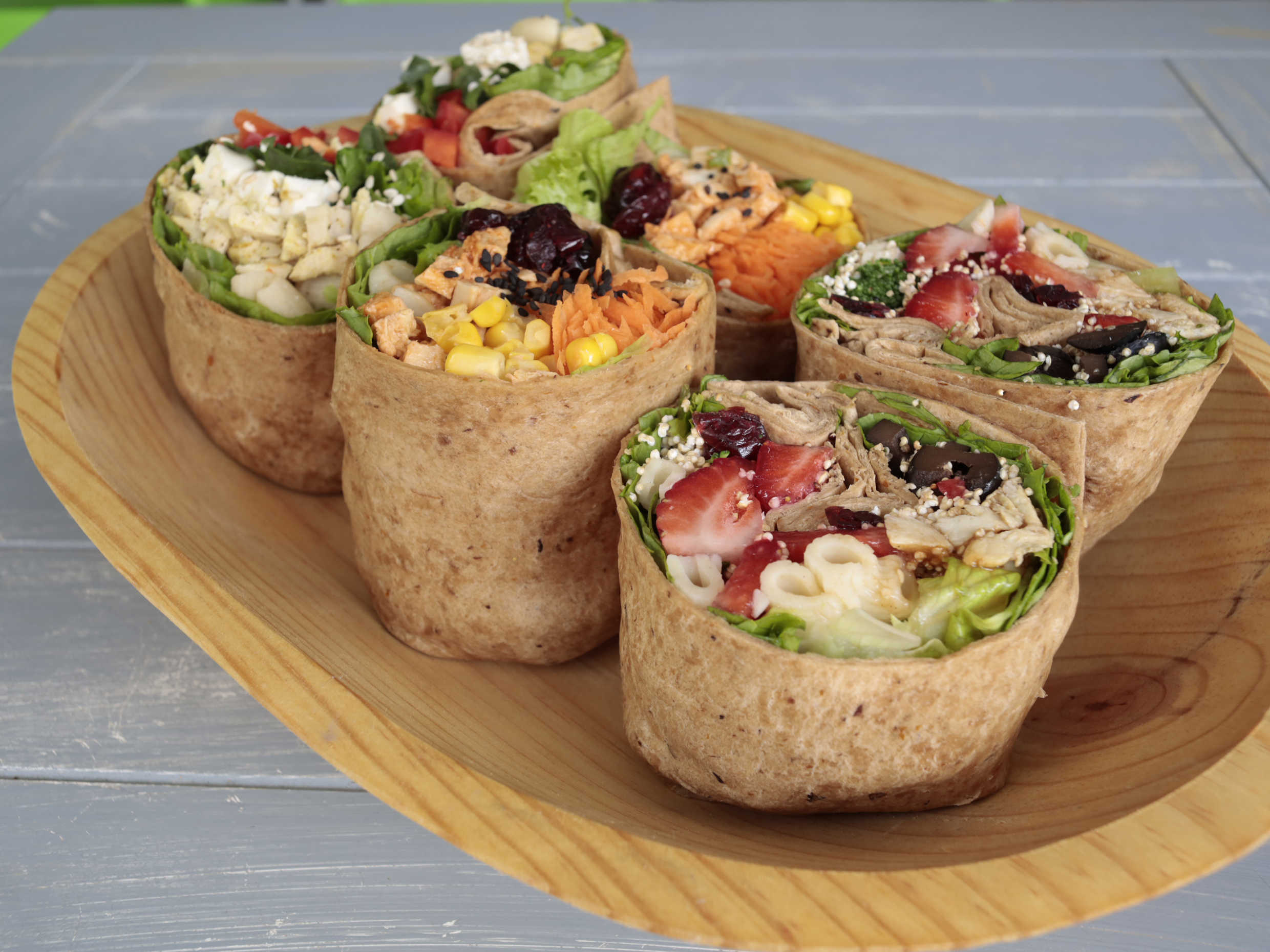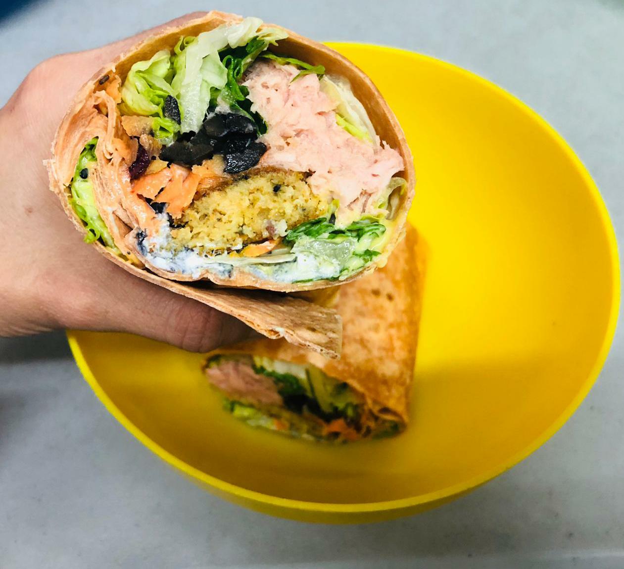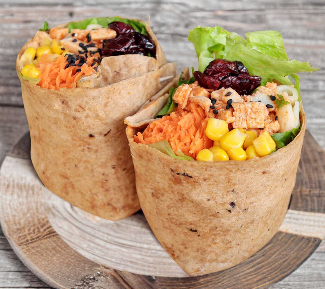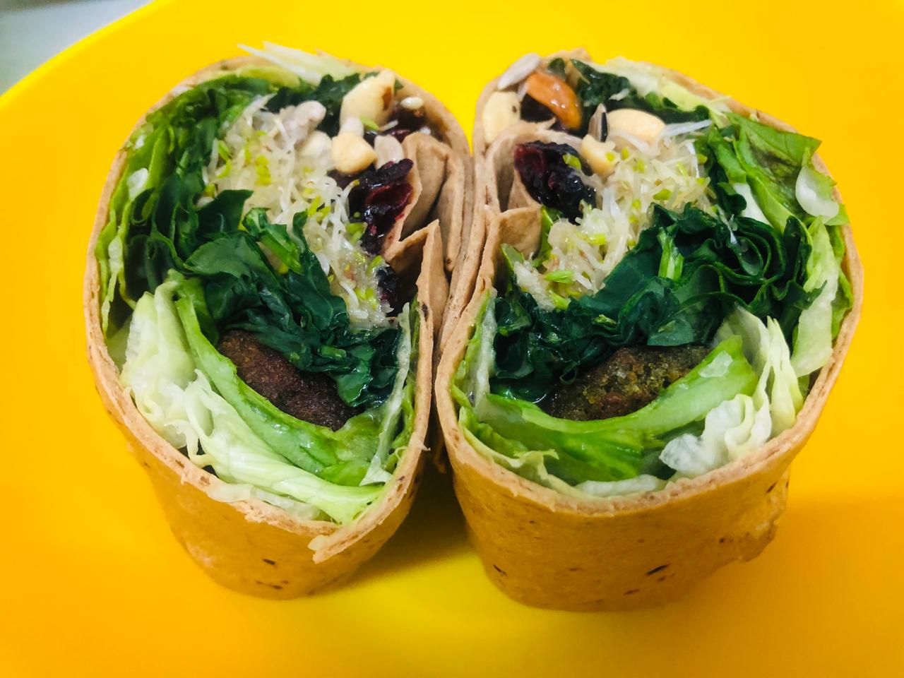 Wrap fresco y delicioso, relleno con lechuga crujiente, pasta suave y una variedad de complementos, semillas y aderezos a elección
