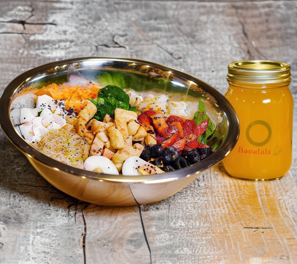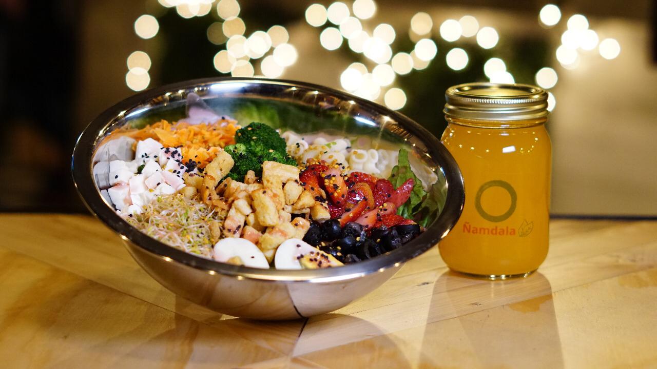Lechuga, pasta, pollo BBQ, piña, tocineta, semilla de ajonjolí y aderezo de mango pasión.