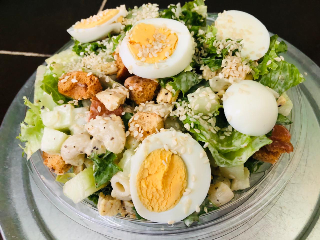 Pasta, pollo a las finas hierbas, huevo, pepino, crutones, aderezo cesar y semilla de ajonjoli