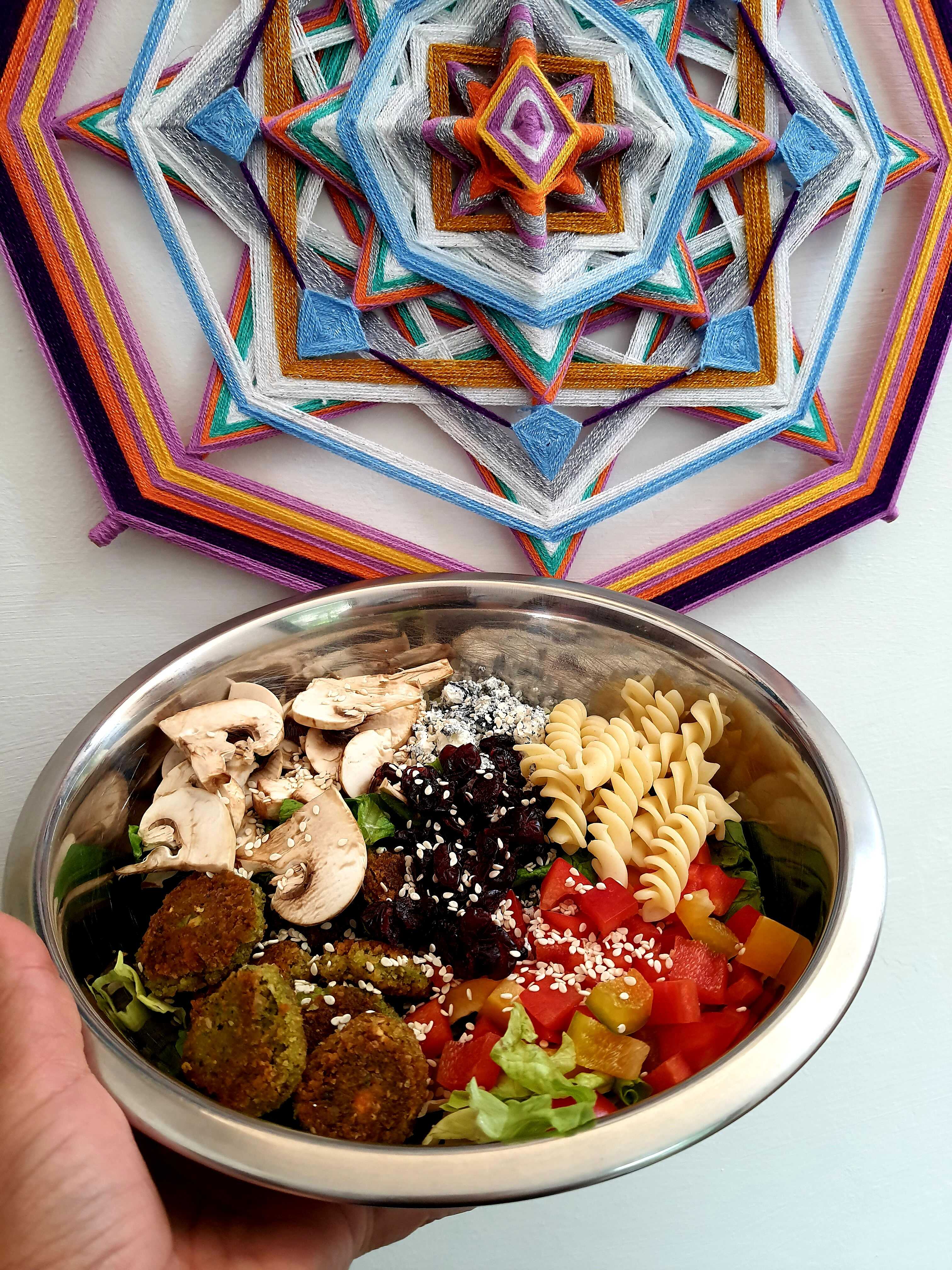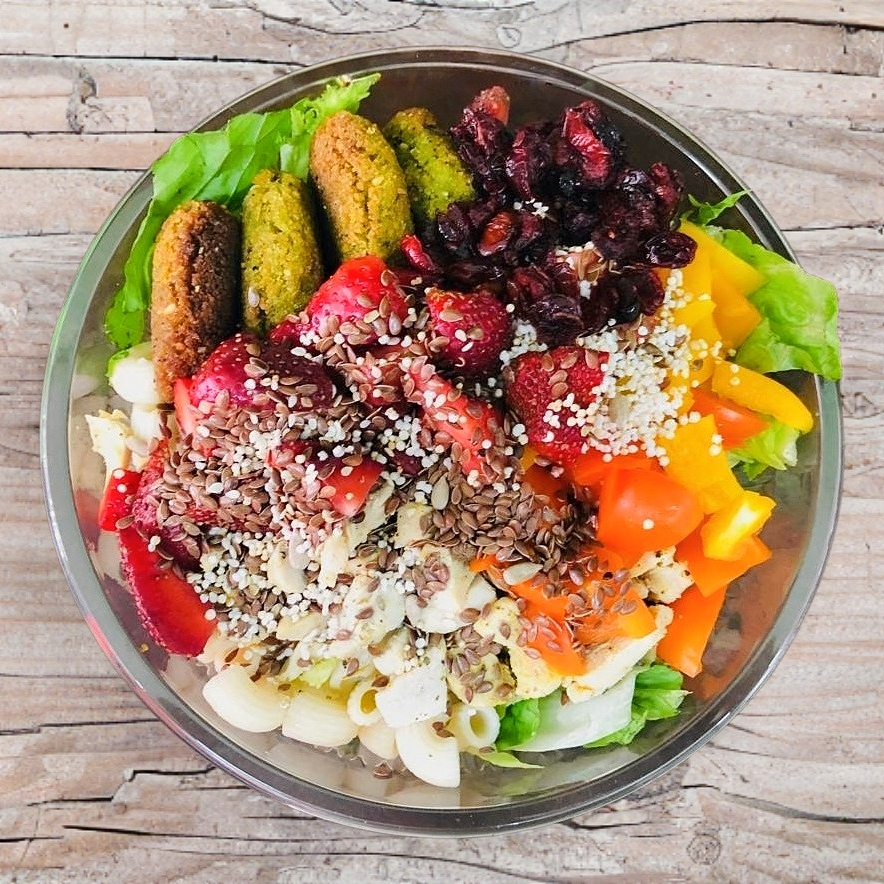 Lechuga, pasta, 4 croquetas de falafel, espinaca, germen de alfalfa, semilla de ajonjolí negro, arándano y aderezo de ajonjolí.