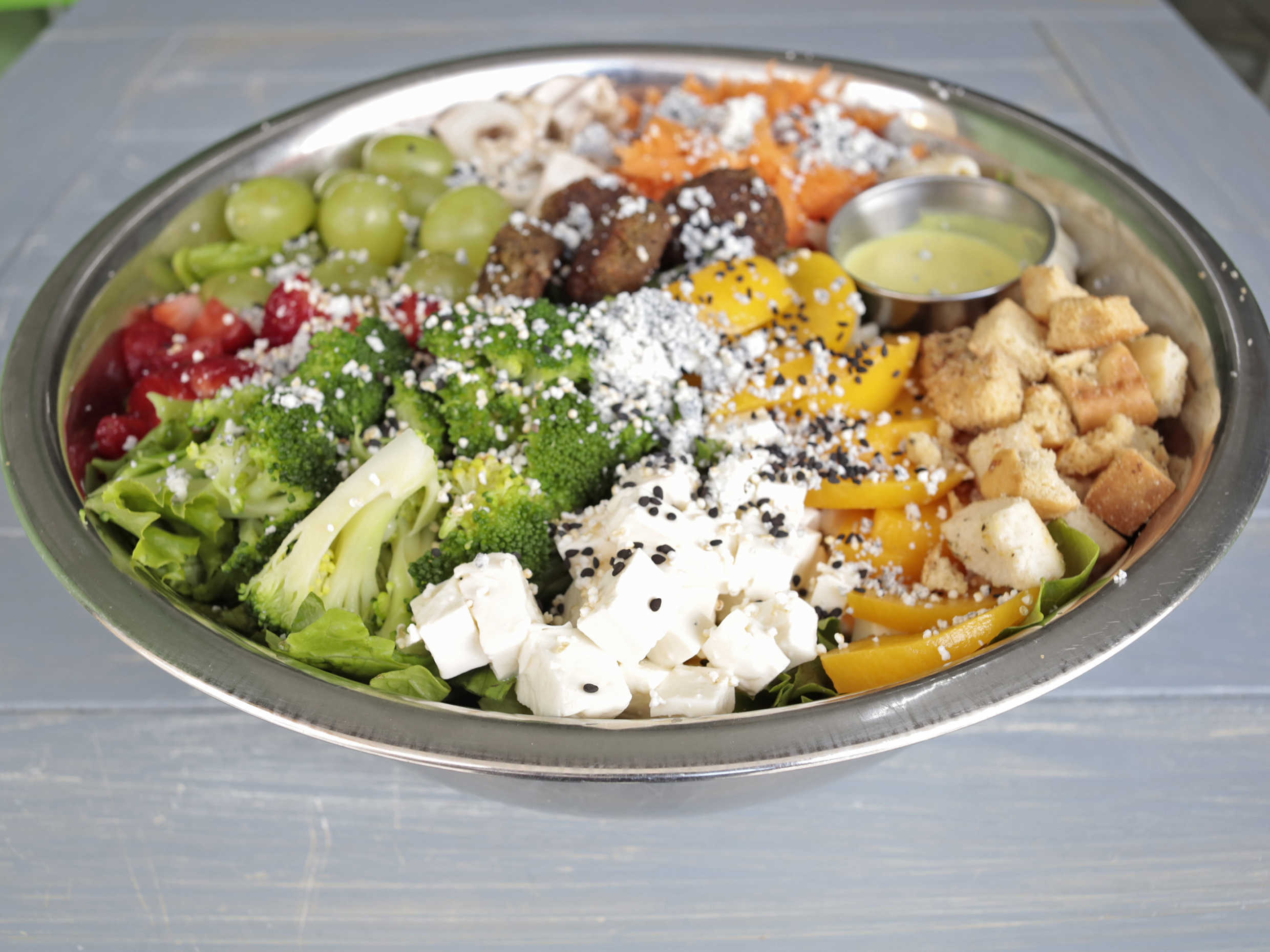 Arma tu ensalada con 1 proteína, 3 complementos, 1 semilla y 1 aderezo. (Porción personal)