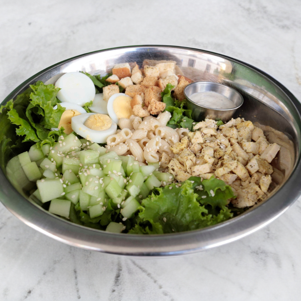 Pasta, pollo a las finas hierbas, huevo, pepino, crutones, aderezo cesar- parmesano y semilla de ajonjoli
