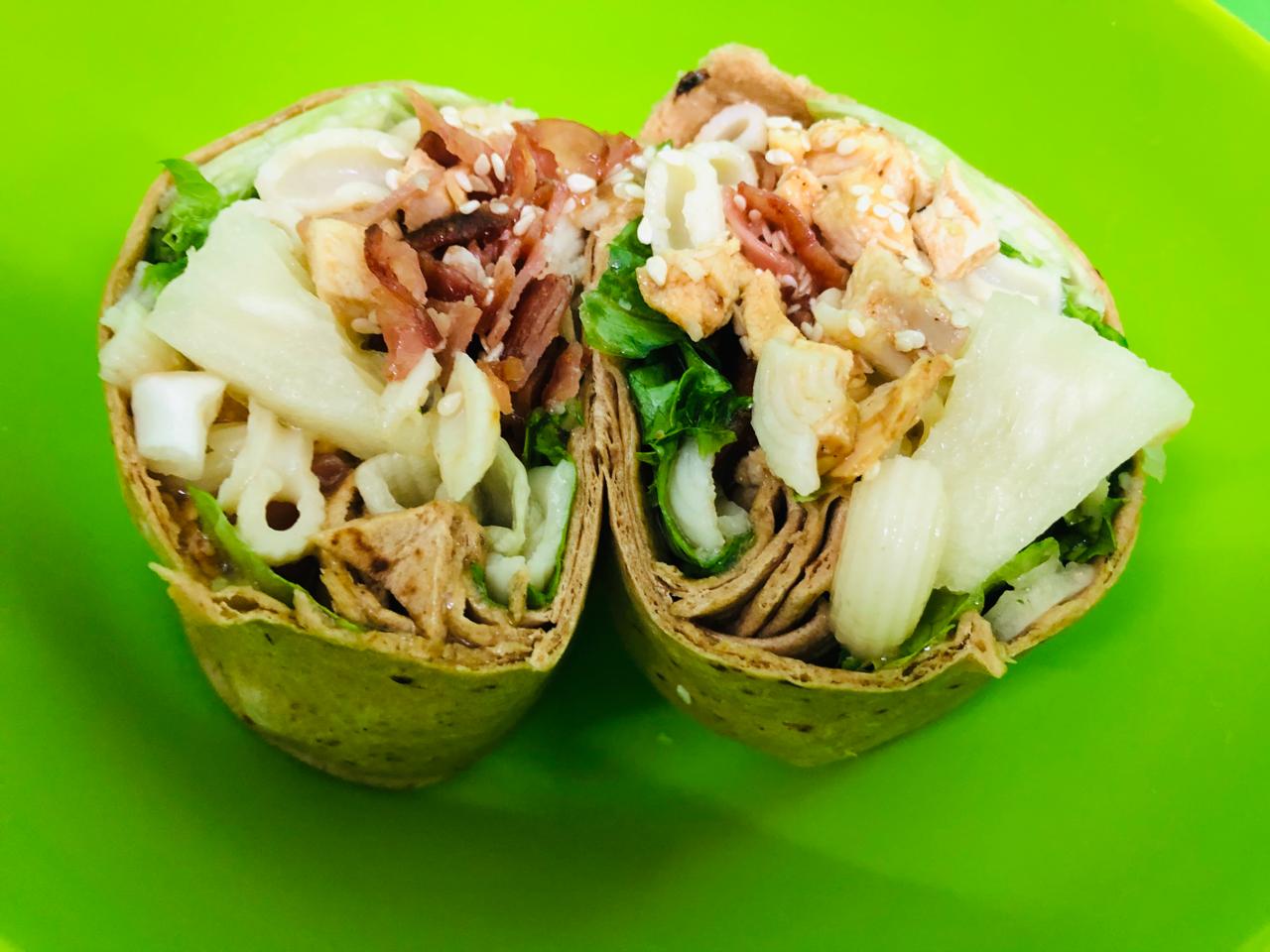 Lechuga, pasta, pollo BBQ, piña, tocineta, semilla de ajonjolí y aderezo de mango pasión.