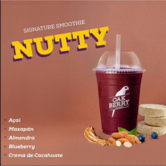 Smoothie a base de agua y açaí 100% natural de 500 ml, avena, plátano, nibs de cacao, miel, crema de cacahuate.