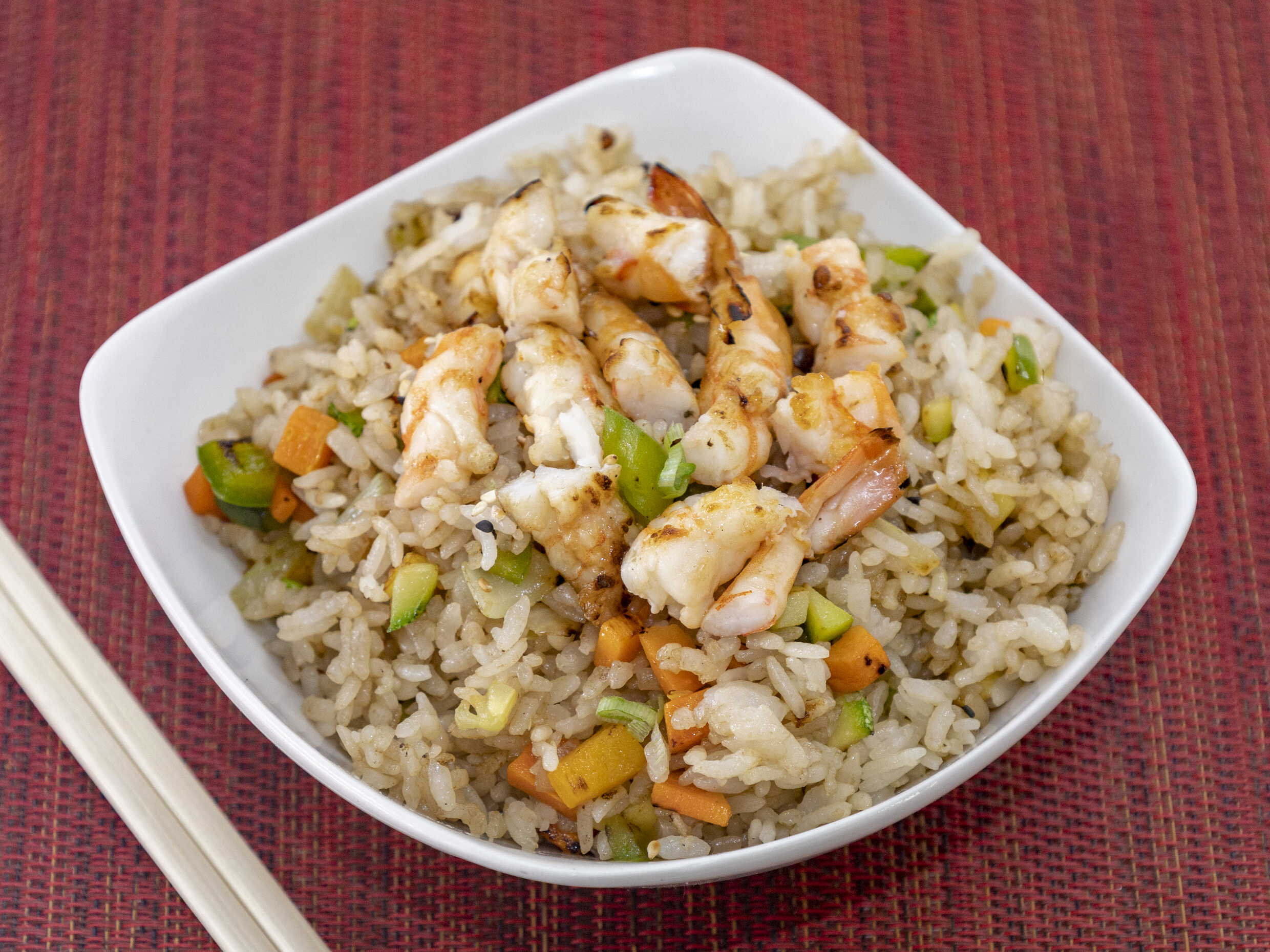 Arroz frito con verdura con camarón. (180g de arroz 90g de verduras y 60g de proteína)