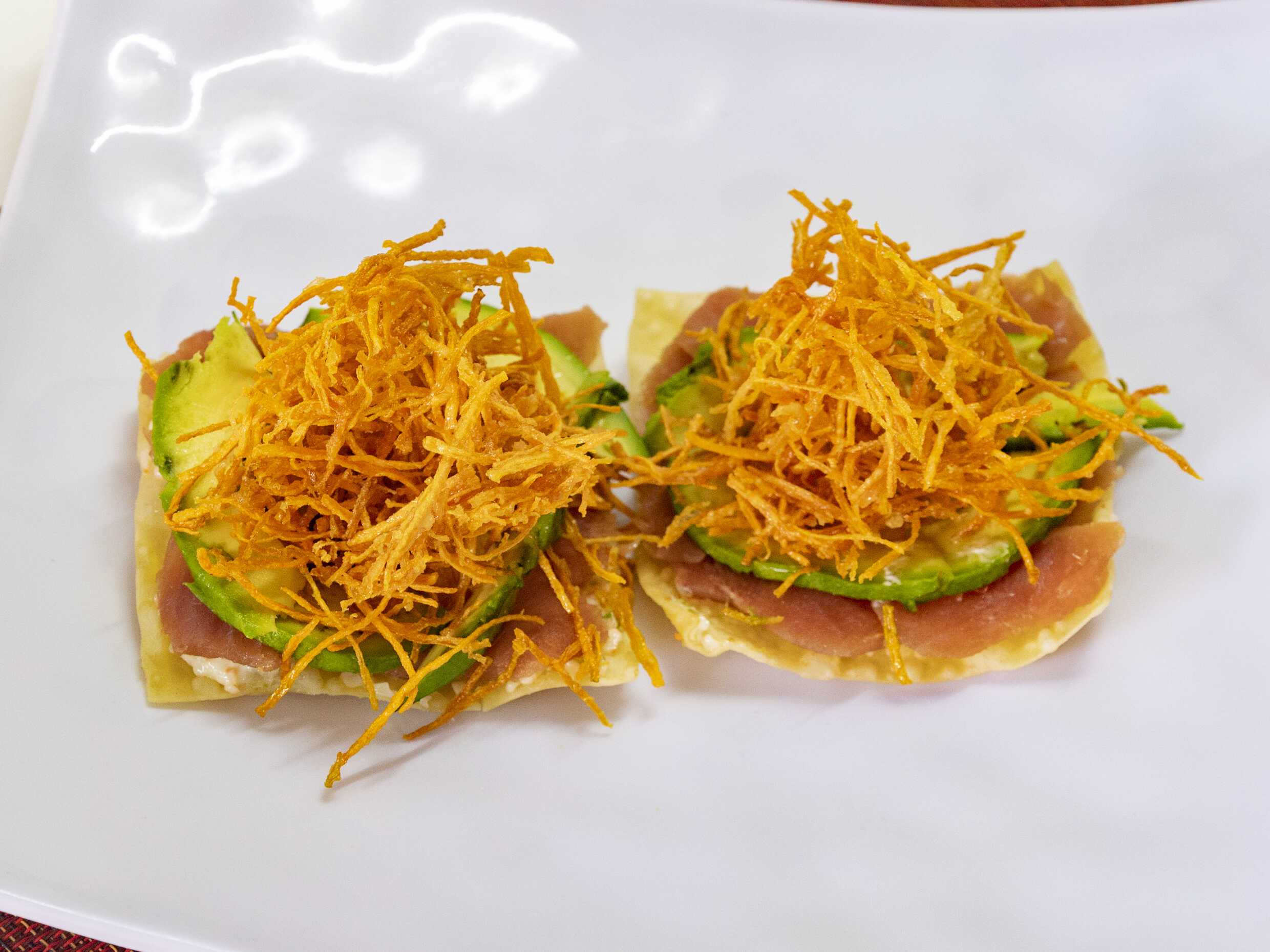 Crujientes tostadas con salsa tampico, aguacate, salsa chipotle y kakiague de zanahoria. 2 Piezas.