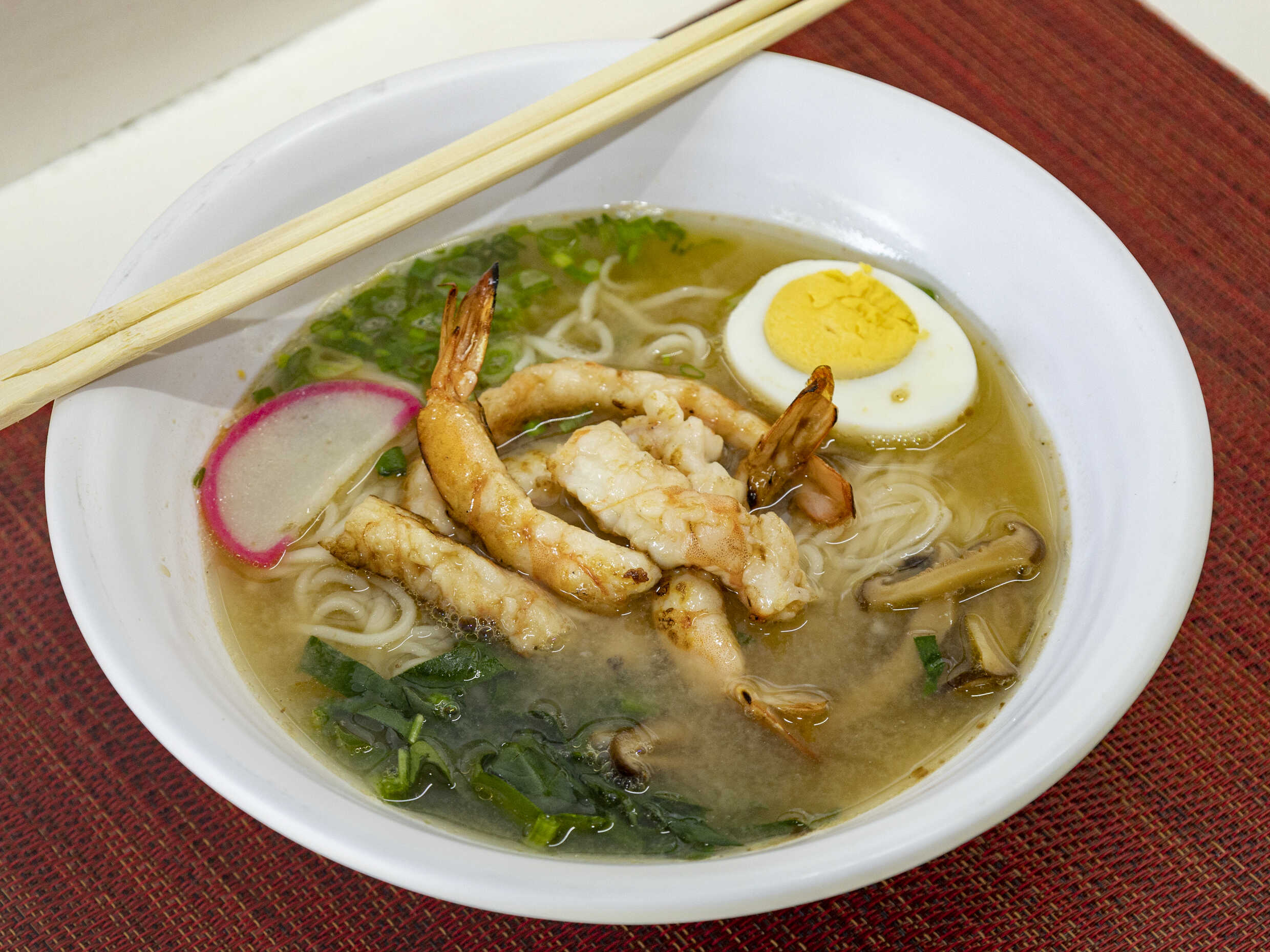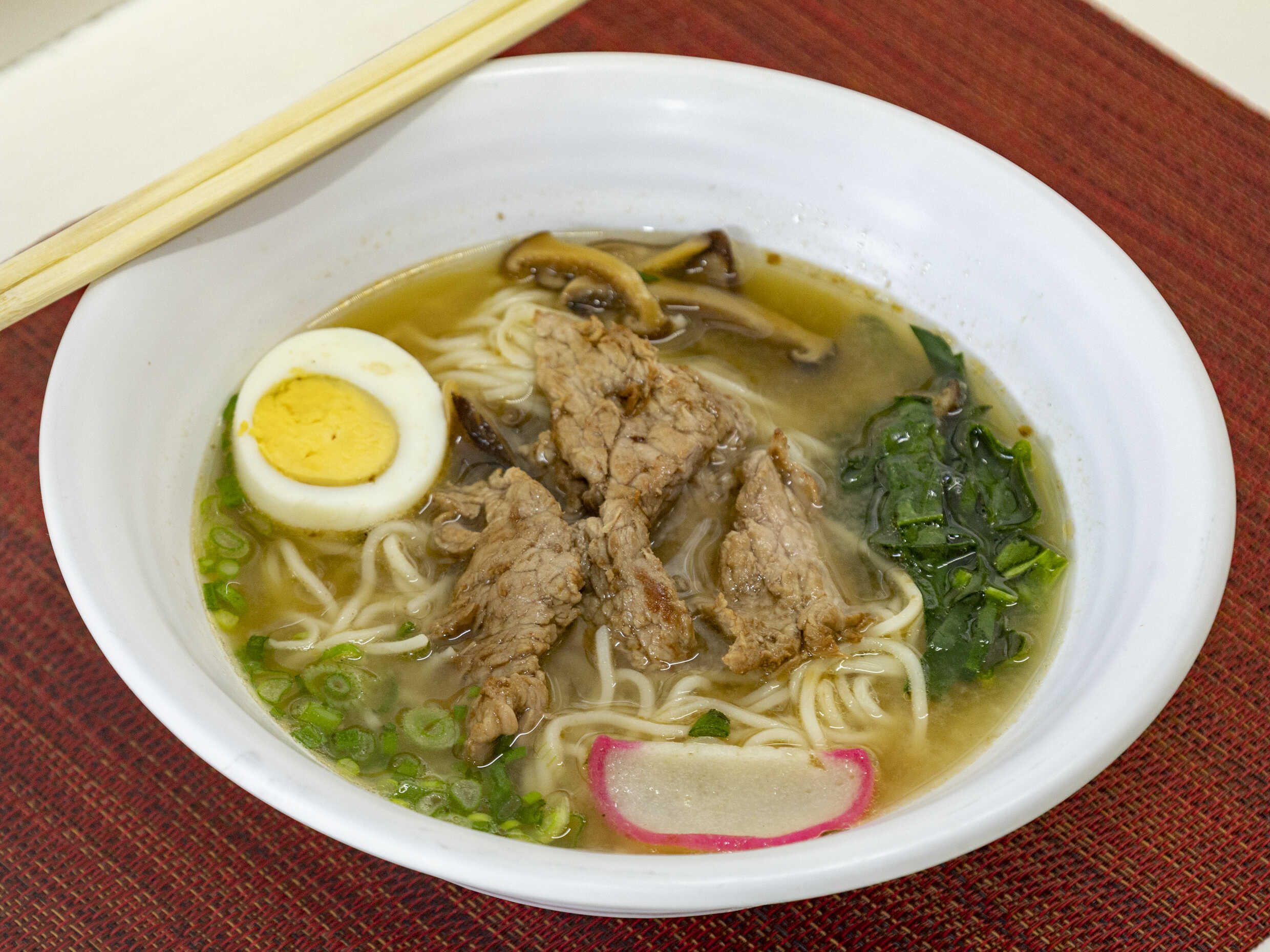Pasta ramen, con huevo, cebollín, naruto y shitake.