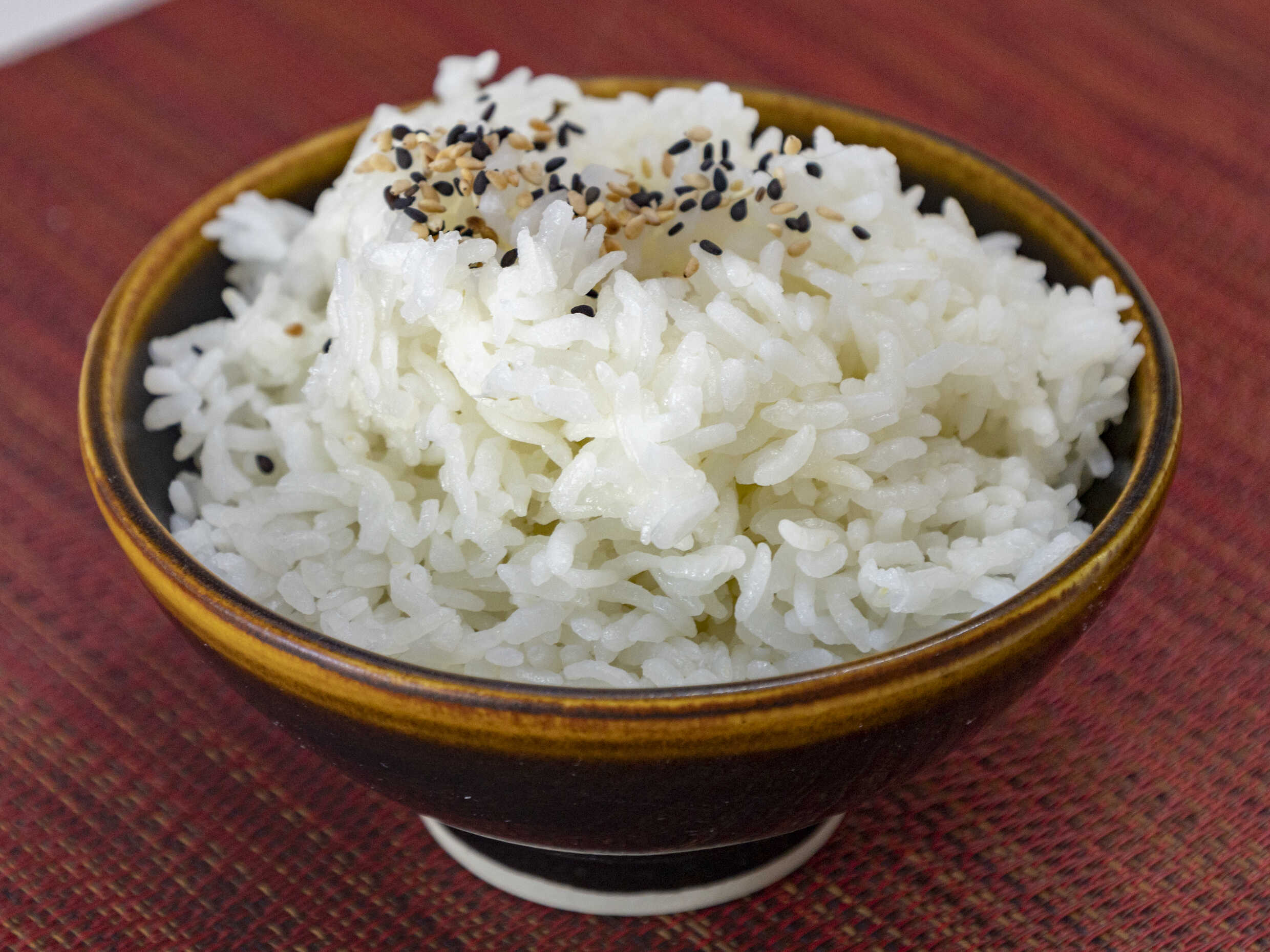 Pechuga de pollo asada con salsa teriyaki servida en arroz al vapor y ensalada.