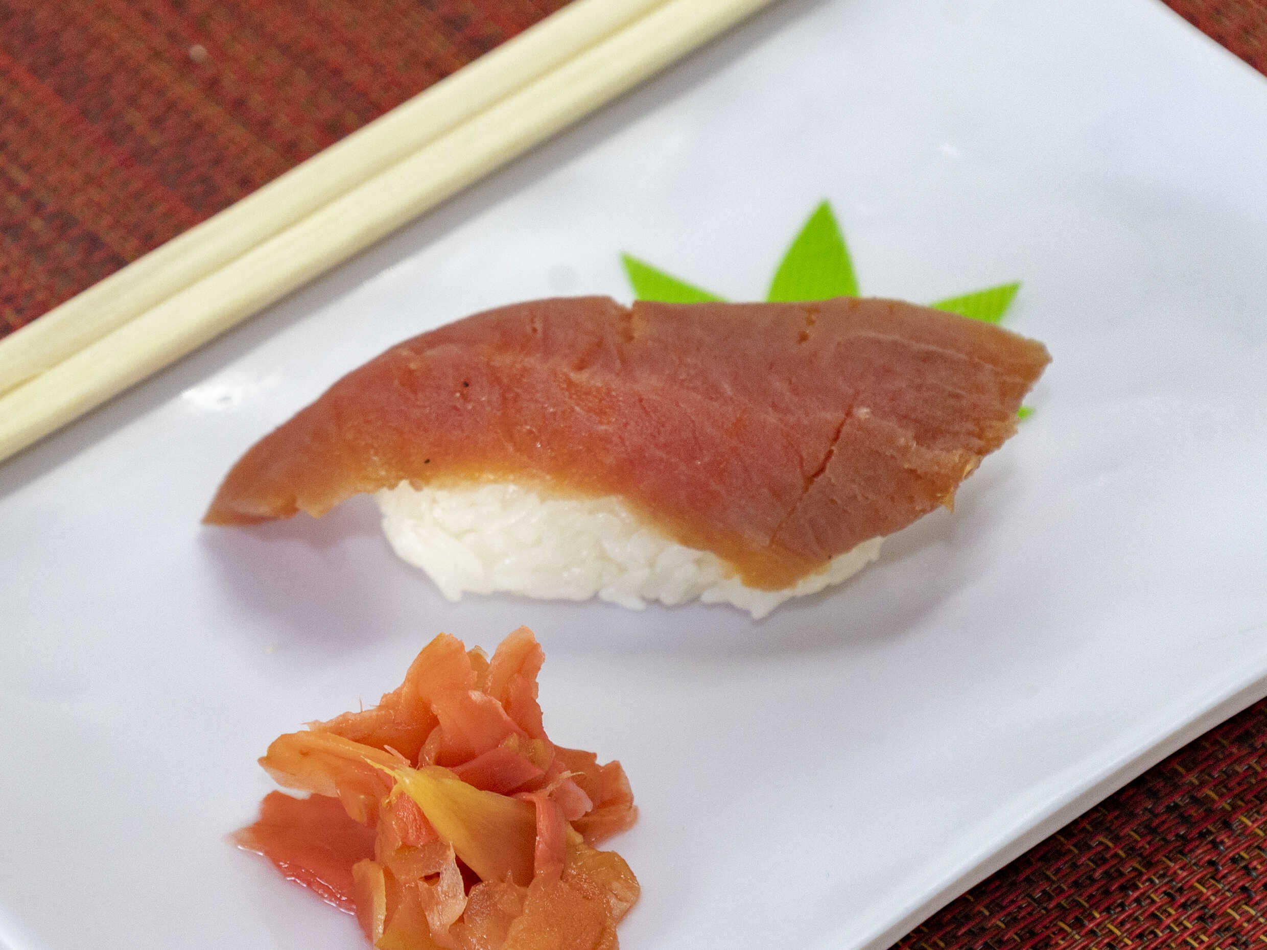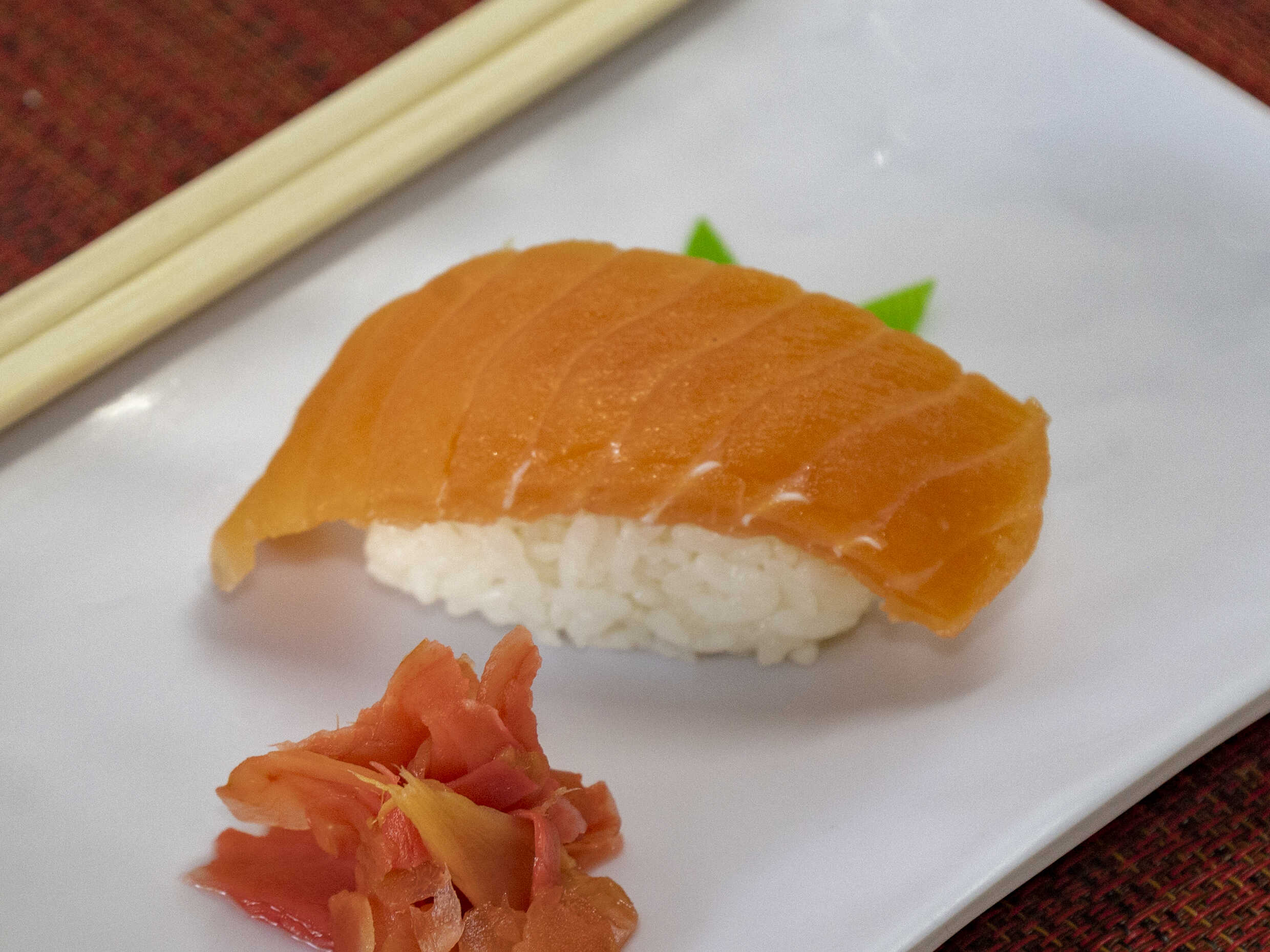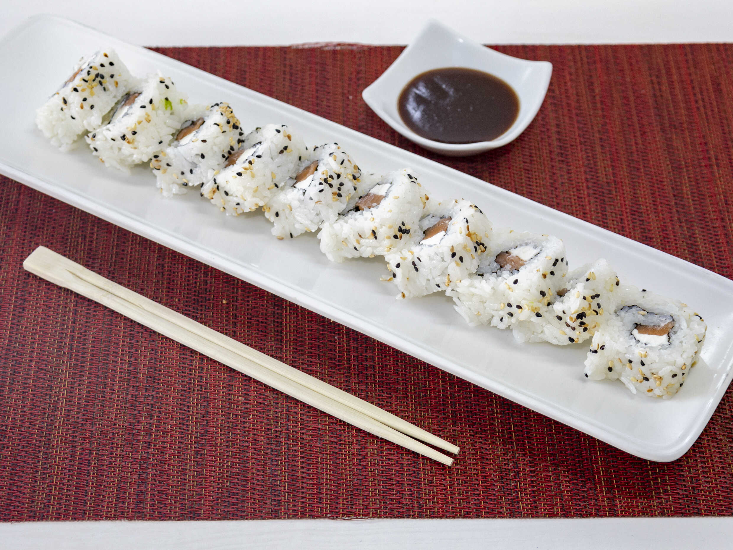 Por dentro salmón y queso crema, por fuera arroz y ajonjolí.