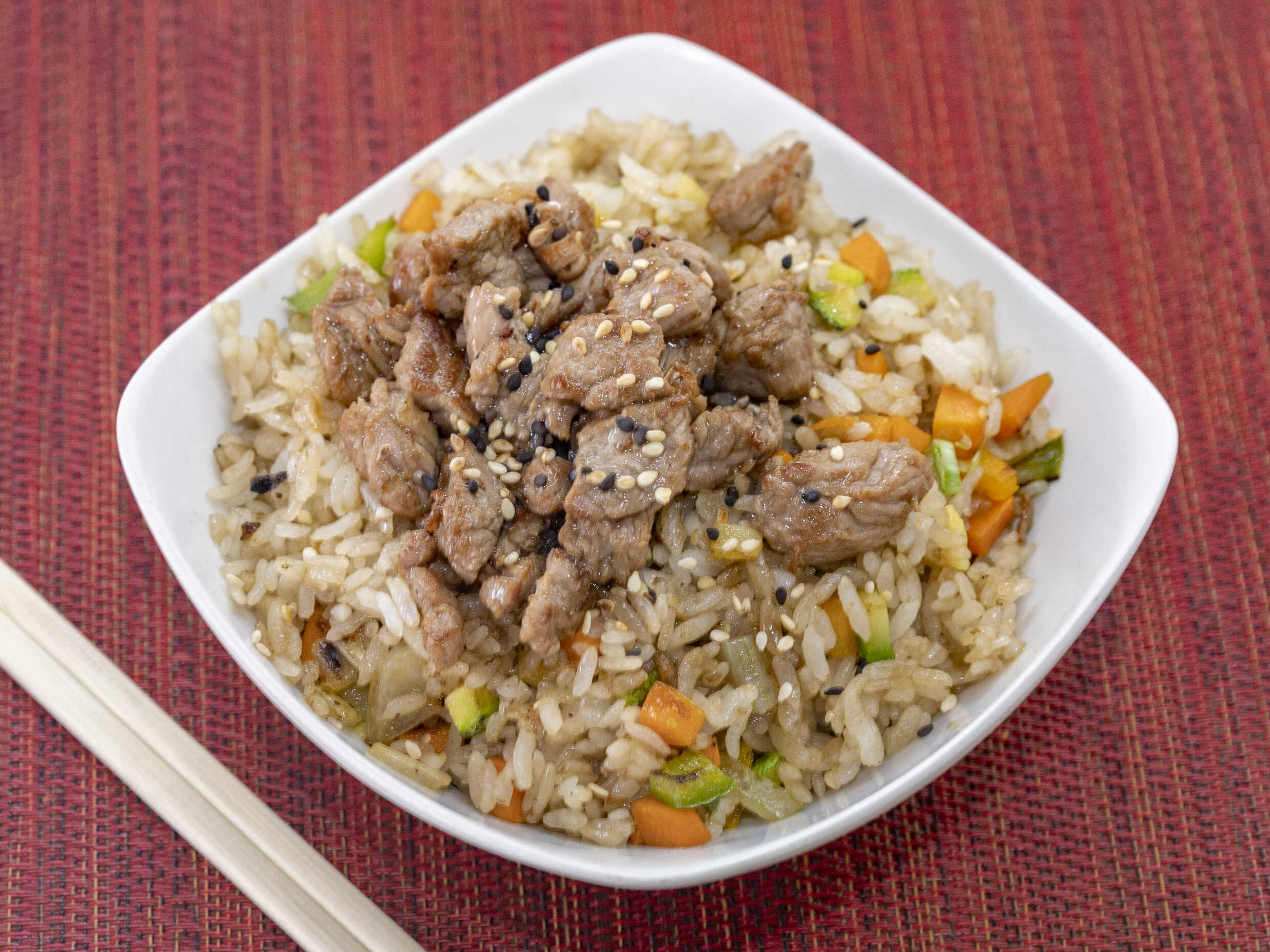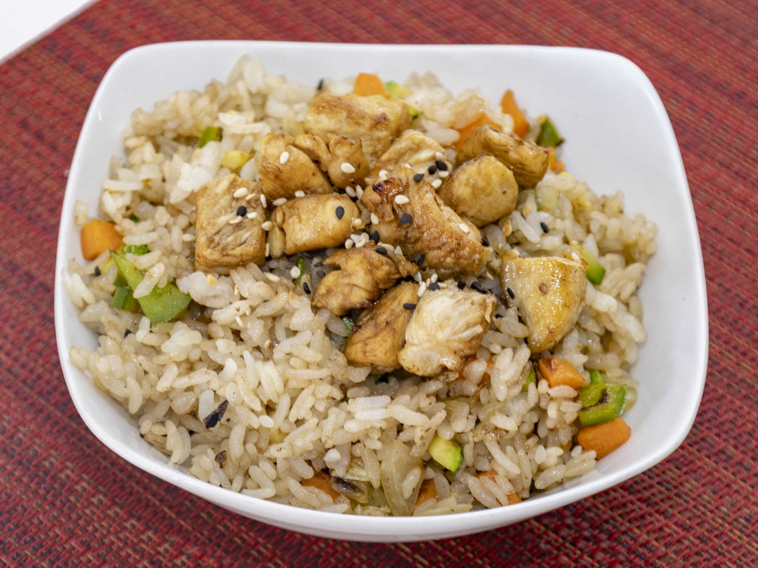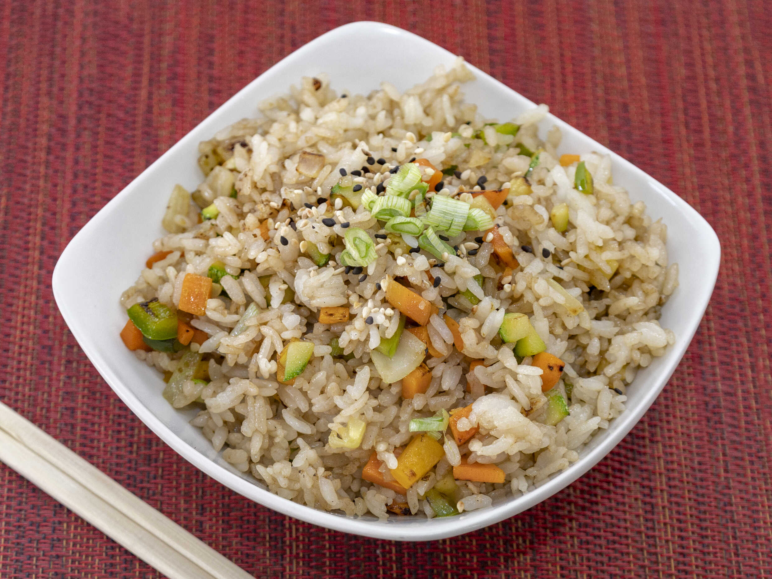 Arroz frito con verduras (cebolla, calabaza, zanahoria y pimiento verde).