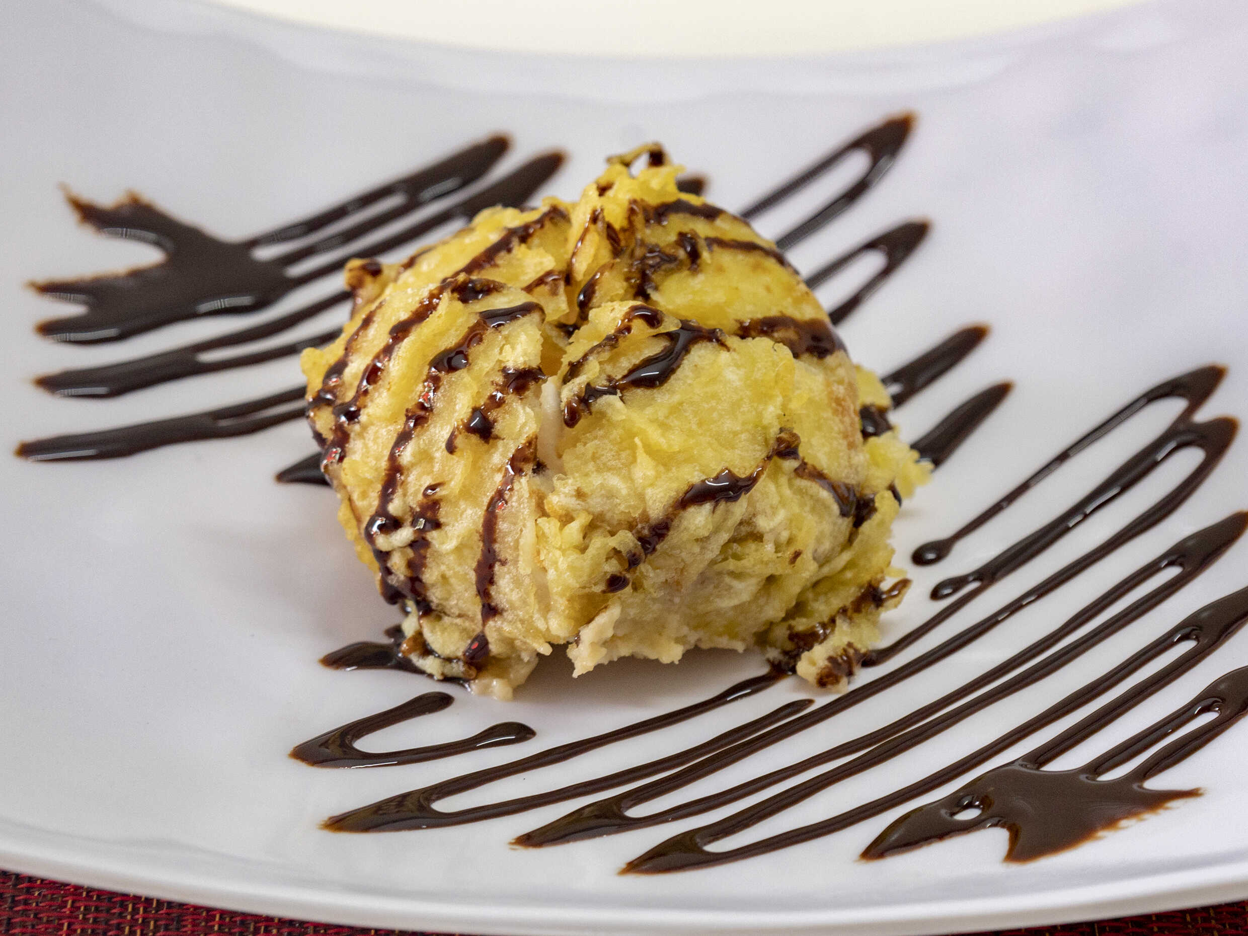 Pan capeado, rellano de helado de vainilla, acompañado de jarales.