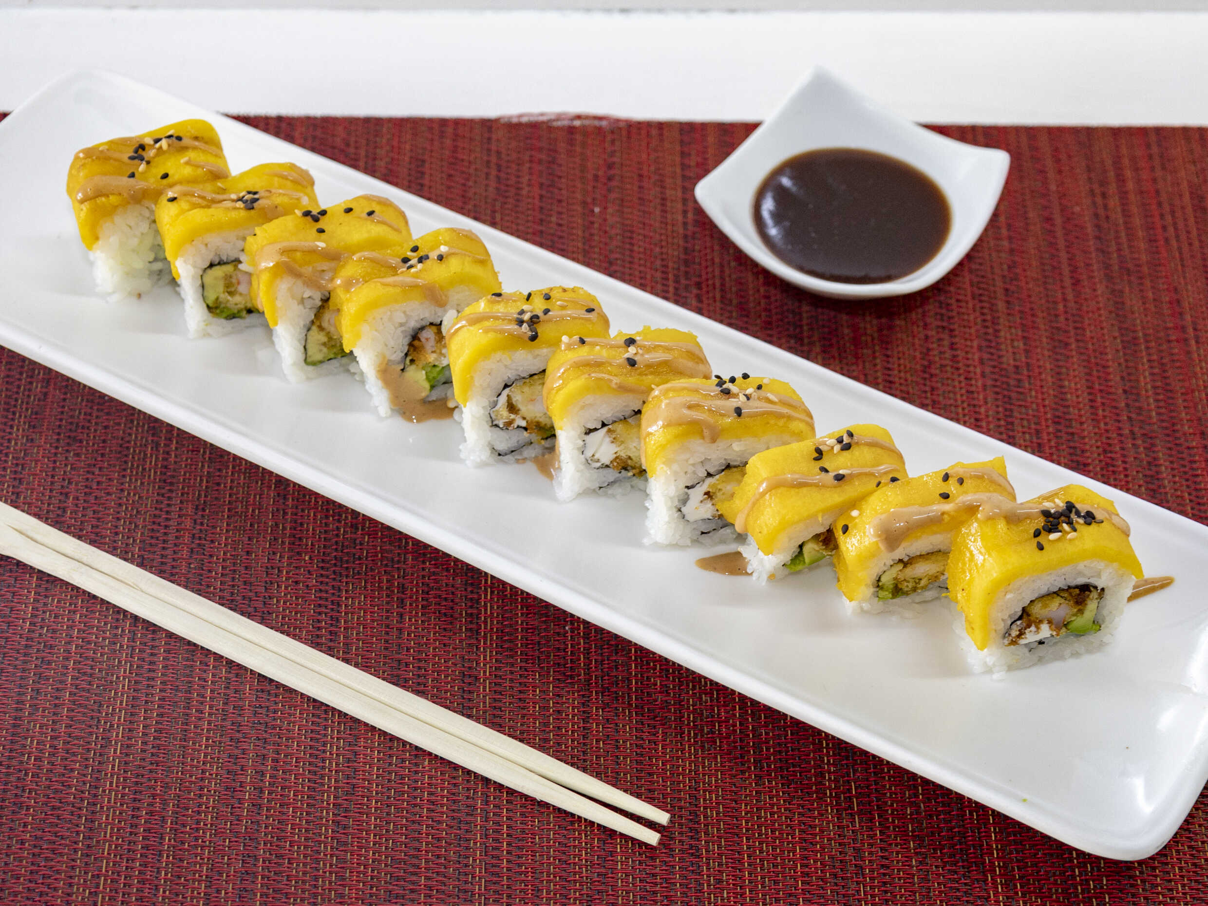 Por dentro camarón empanizado, queso crema y pepino, por fuera mango y aguacate servido con salsa dulce y chipotle.