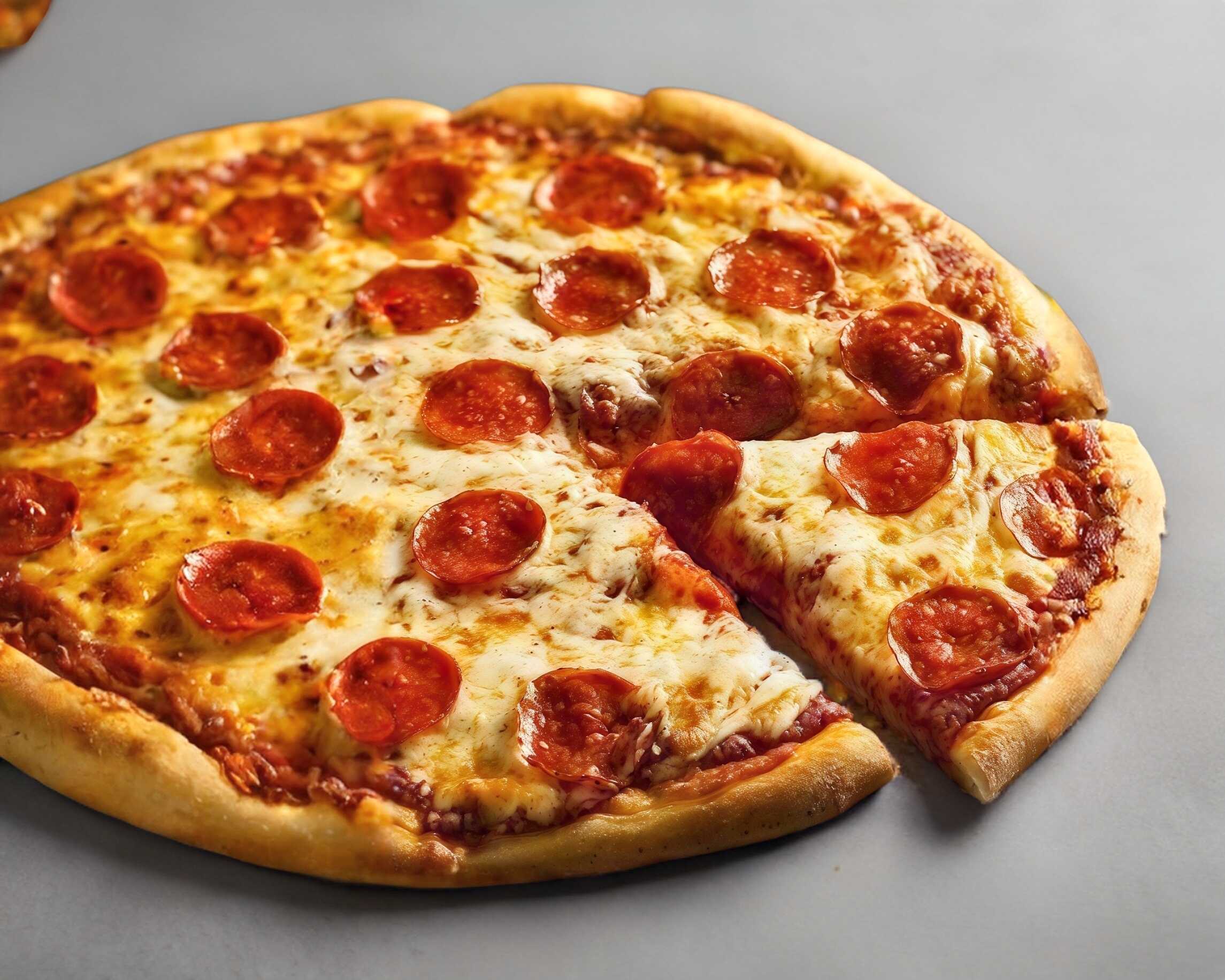 Pizza grande de 14 pulgadas cortada en 8 rebanadas, pizza clásica de pepperoni con queso mozzarella y salsa pomodoro.