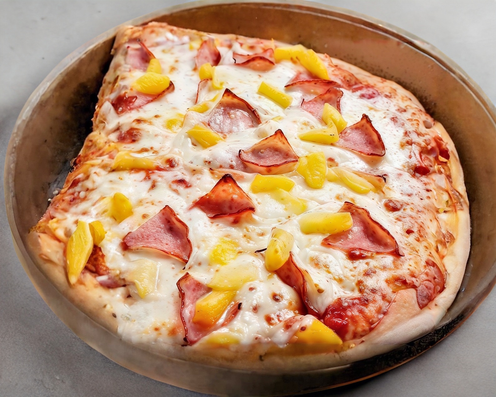Pizza Grande de 14 pulgadas cortada en 8 rebanadas, pizza con jamón y piña sobre base de queso mozzarella y salsa pomodoro, combinación dulce y salada., con orilla de hierbas finas.