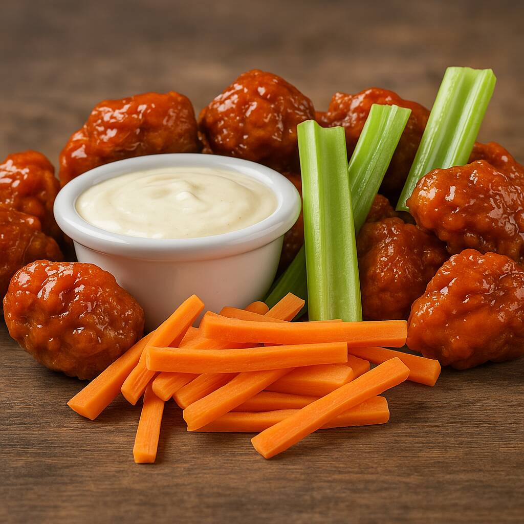 Medio kilo de deliciosos Boneless con el mejor sabor y calidad, incluye hasta dos salsas de tu elección, porcion de vetegales y aderezo.