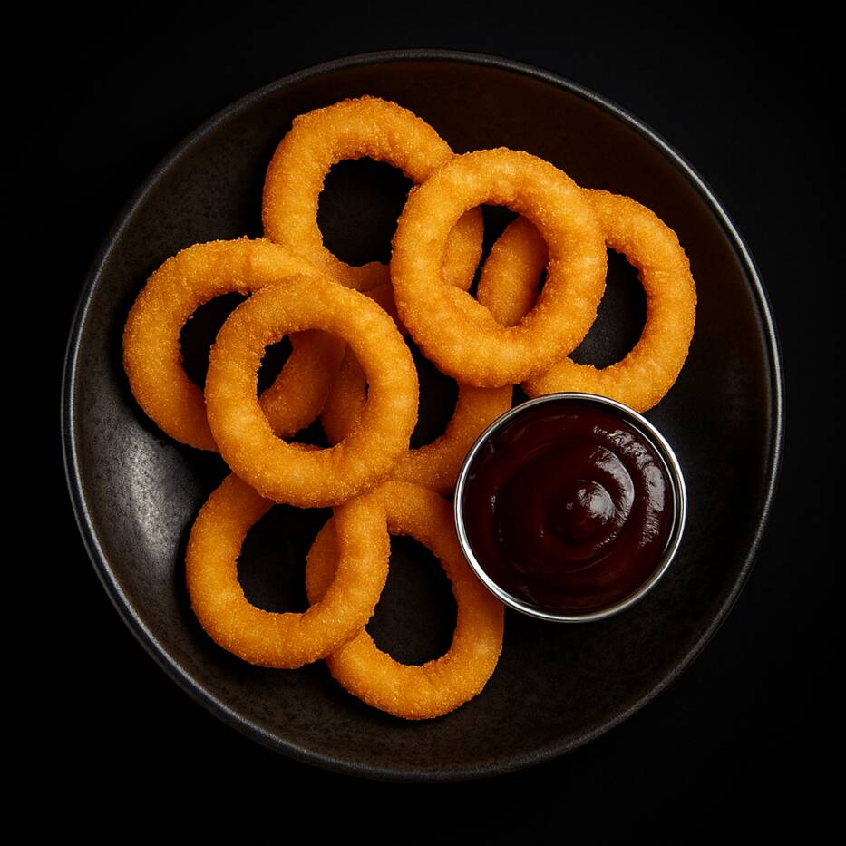 Aros de cebolla (7pzas), incluye bastones de vegetales y una porción de aderezo o salsa de tu preferencia.