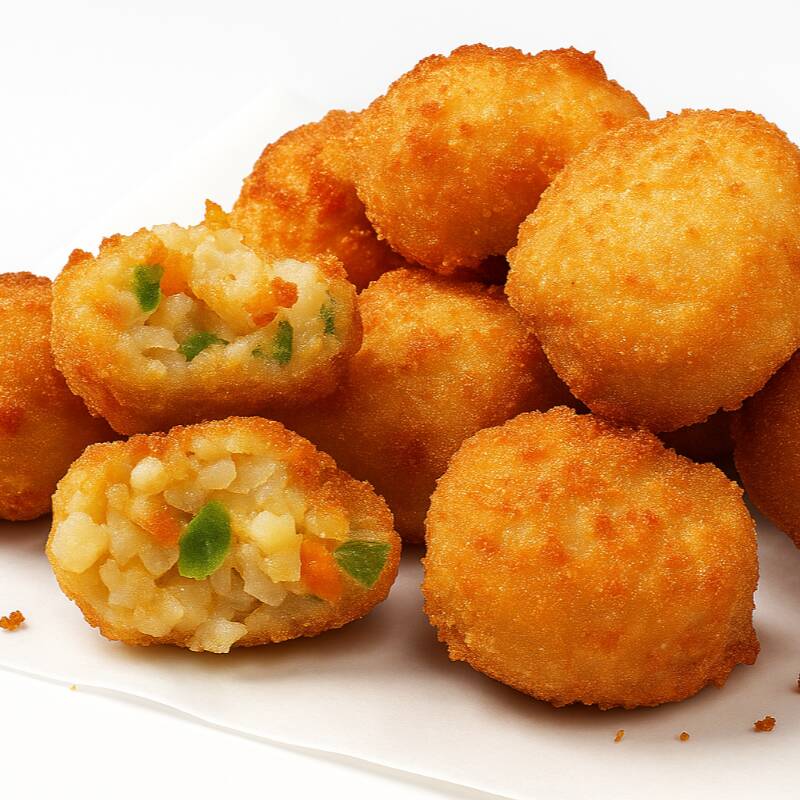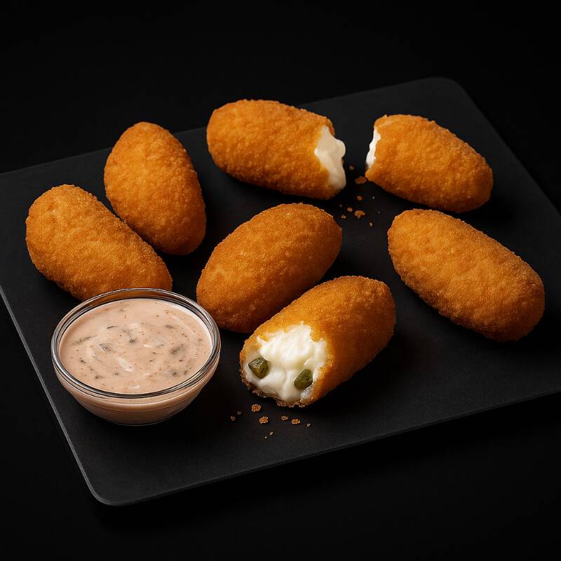 Orden de 6 piezas de bolitas de papa con jalapeño, jalapeño y queso cheddar.