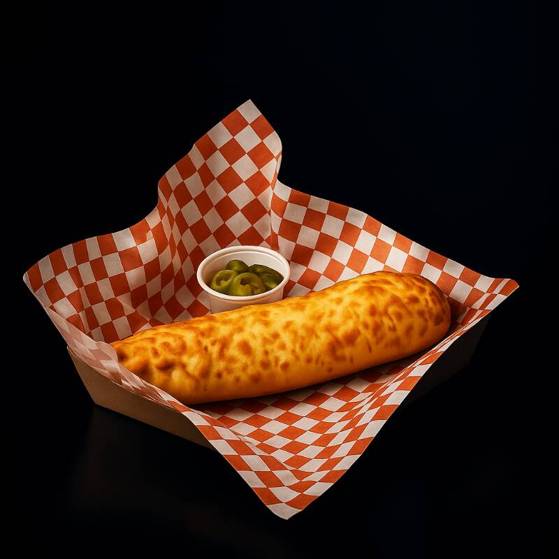 Delicioso rollo de pan horneado de 20-25cm con tiras de pechuga de pollo, quesos mozzarella, provolone y parmesano, tocino ahumado, aderezo cesar cremoso y cebolla.