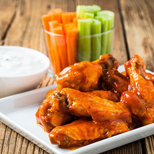 Alitas 8 pzas, incluyen bastones de vegetales y aderezo ranch.