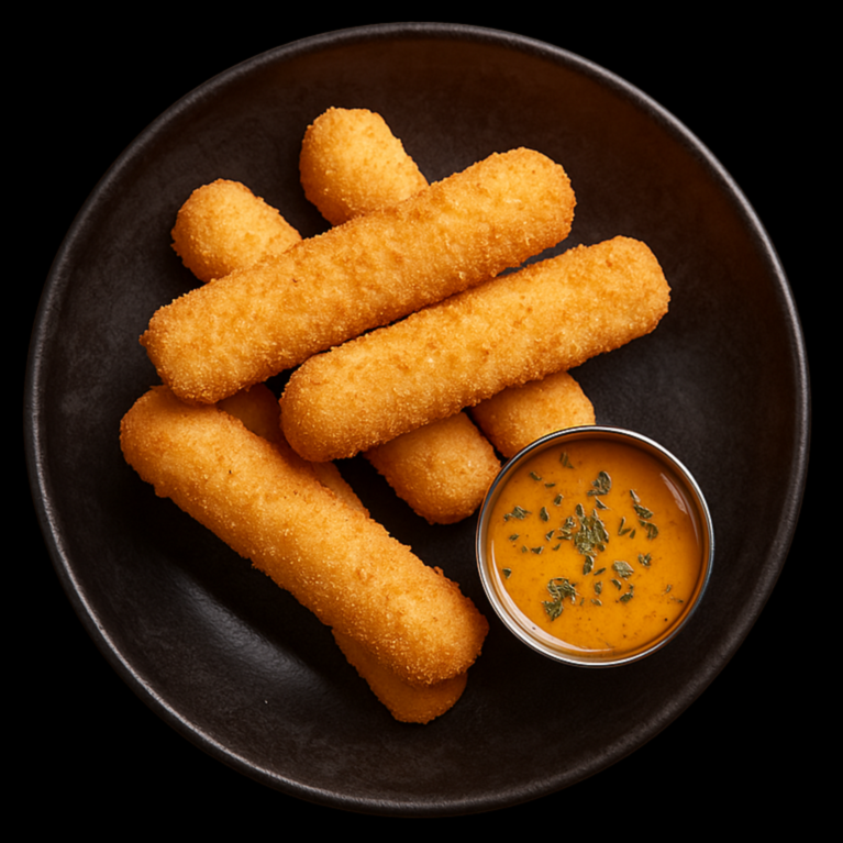 Dedos de queso (6pzas), incluye bastones de vegetales y una porción de tu salsa o aderezo de tu preferencia.