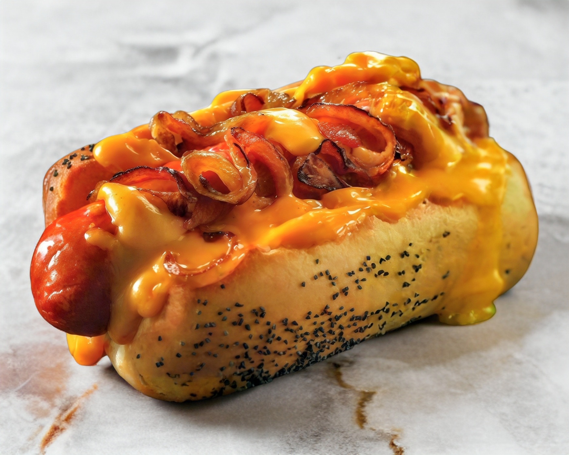 Especial Salchicha Frankfurt 100% de pavo envuelta en Tocino, cebollitas y pimientos cocinados y caramelizados a la plancha, bañado con nuestros cremosa salsa Queso Cheddar