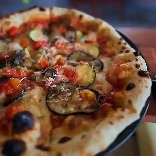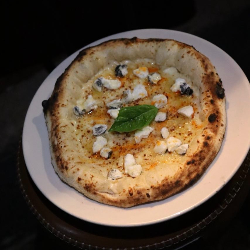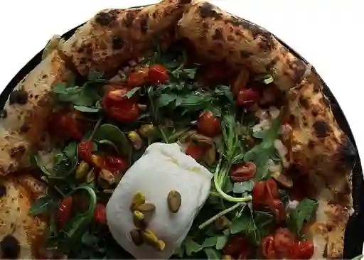 Pomodoro, mozzarella, alcachofa, queso de cabra, pecorino, jitomate deshidratado y aceite de trufa blanca.