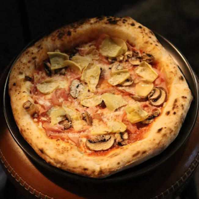 Pomodoro, jamón italiano, champiñones cremini, mozzarella y alcachofa.